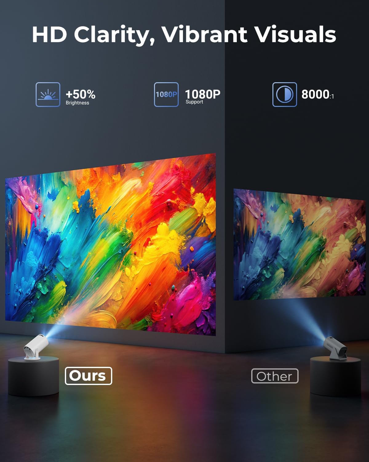 2025 Upgraded Movie Projector: This video projector offers a brightness of 8000 Lux and supports 1080P display. With advanced LED technology and uniform illumination, it enhances clarity and brightness, ensuring consistent image quality. Featuring a 0.9:1 short throw ratio, it supports screen sizes from 30 to 200 inches (ideal for 40–100 inches), offering vivid, dynamic visuals—ideal for indoor bedrooms and outdoor movie screenings