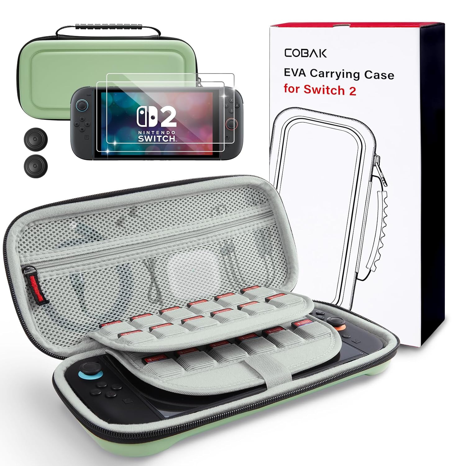 CoBak Large Capacity Carrying Case for Nintendo Switch 2 (2025) – 3 in 1 Accessories Bundle with 2 Screen Protectors, Thumb Grip Caps, 24 Game Cartridges, Hard Shell Portable Travel Pouch, Matcha