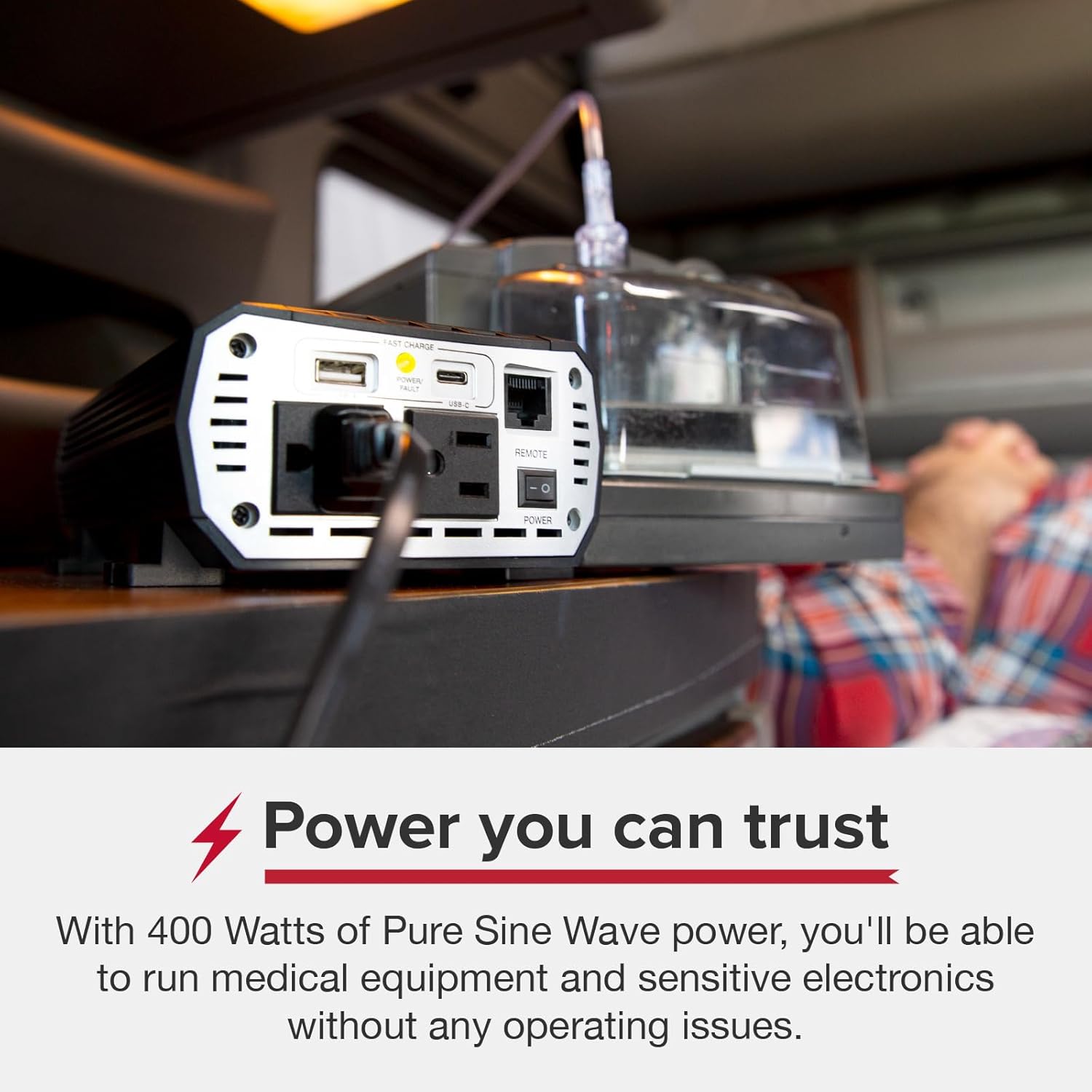 400W Continuous / 800W Peak Power: With 400 Watts of Pure Sine Wave power, you’ll be able to charge and power your medical devices, sensitive electronics, smartphones, laptops, entertainment devices, and other mobile devices – safely and reliably.