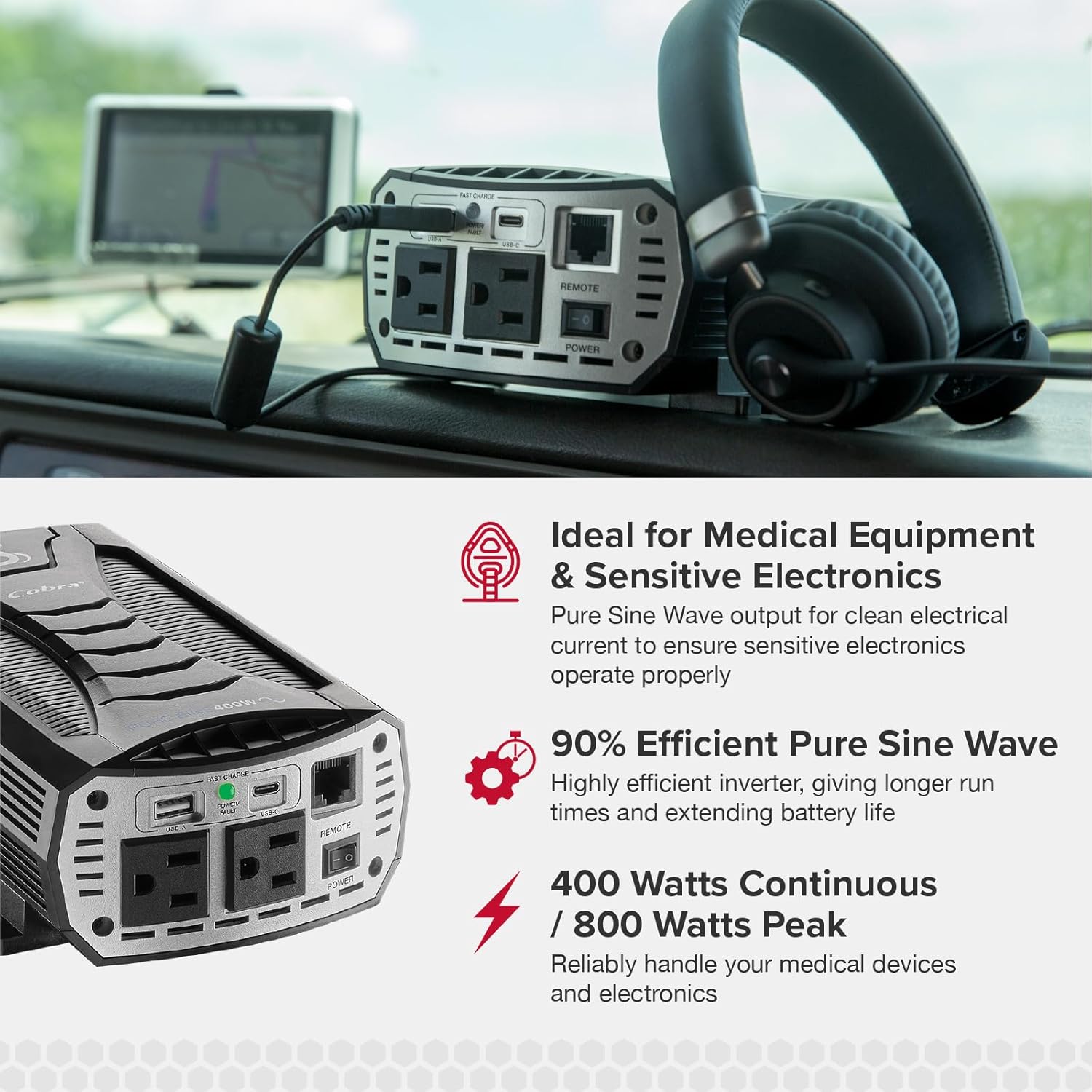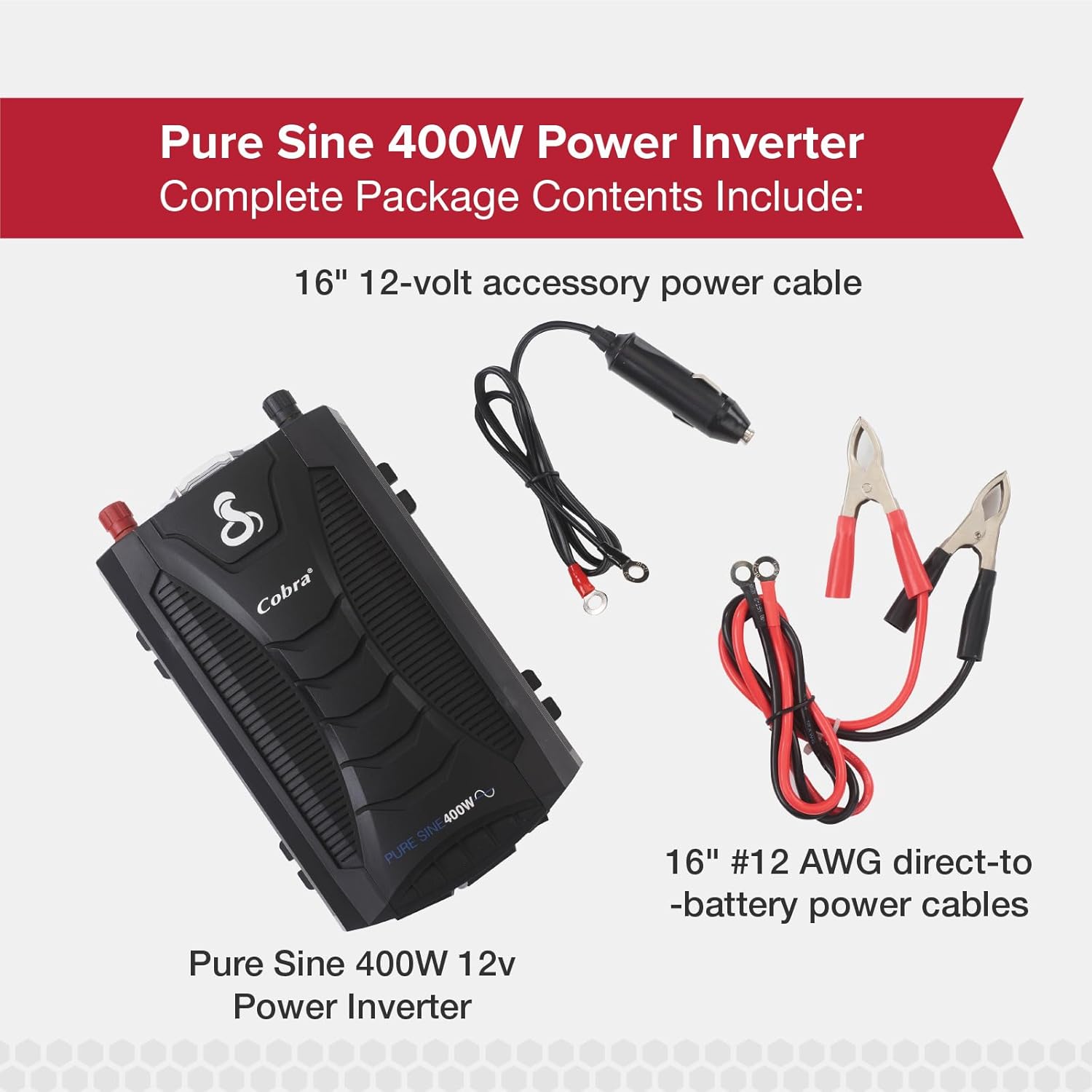 Harness the power of your vehicle’s DC battery! Power up your next pregame, add the convenience of home appliances on your next road trip, or even turn your car into a mobile office. The Cobra PURE SINE 400-Watt Power Inverter turns your car battery into usable A/C household current. It is ideal for medical equipment & sensitive electronics, as well as pro drivers, campers, RV enthusiasts, or for when a power outage occurs. Count on Cobra for power where you need it. Includes 16″ #12 AWG power cable, 16″ 12V accessory cable, and quick-start guide.