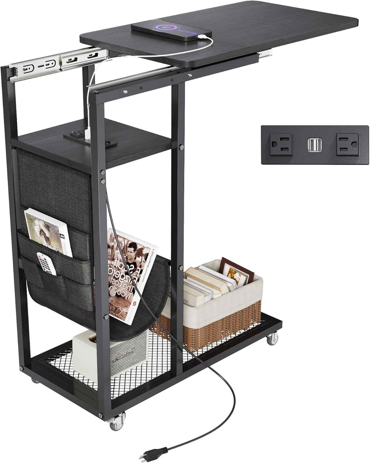 Colima C Shaped End Table with Charging Station (Black, Extra Large)