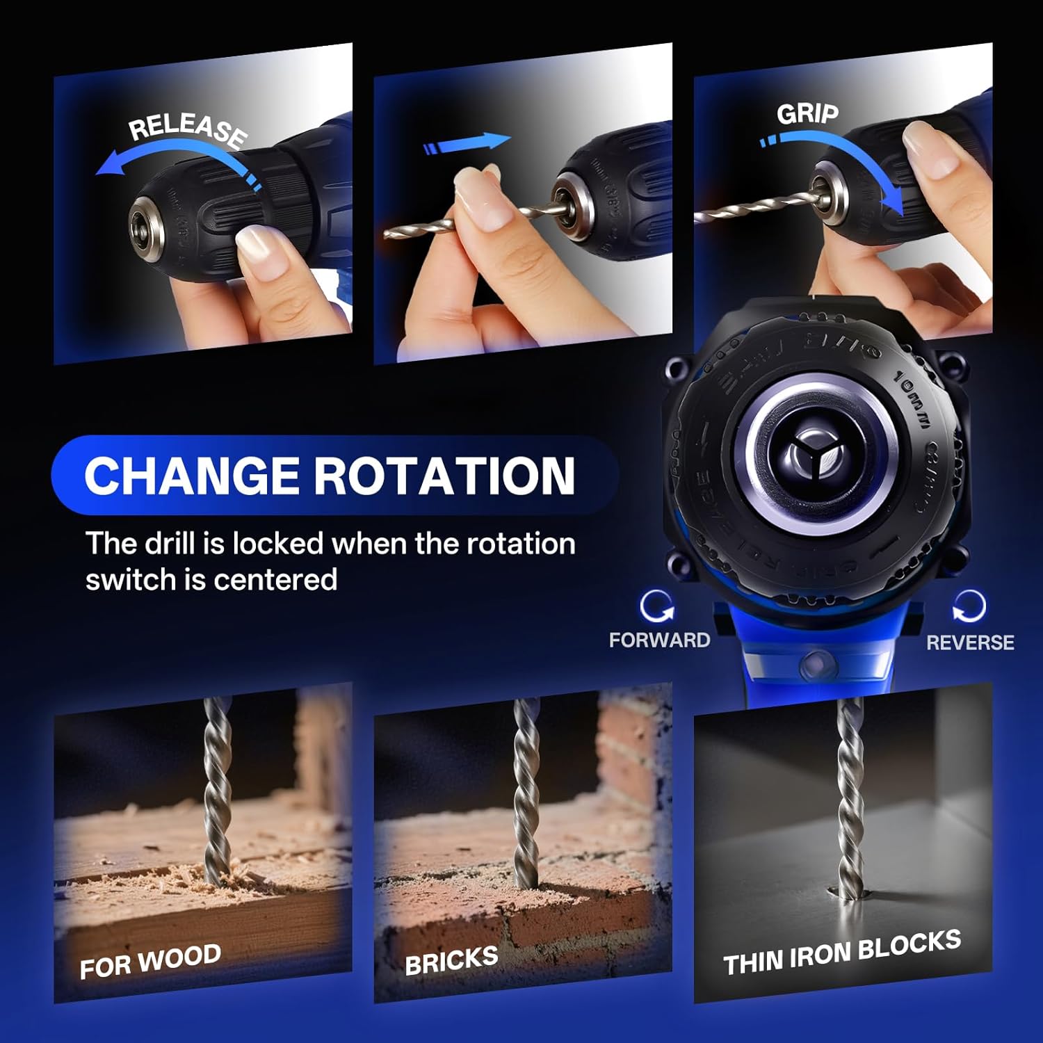 【20V POWER DRILL & 2.0 Ah BATTERY】 The 20V cordless power drill is powered by a 2.0Ah high-capacity lithium ion battery for longer working hours. A 2.5-hour charger is included. The electric drill features 3/8″ (10mm) keyless chuck and 25+1 torque setting with max 266 in-lbs torque. It holds the bits tight without falling off. 2 variable speed (0-350RPM and 0-1300RPM) allows you to easily control the drilling speed.