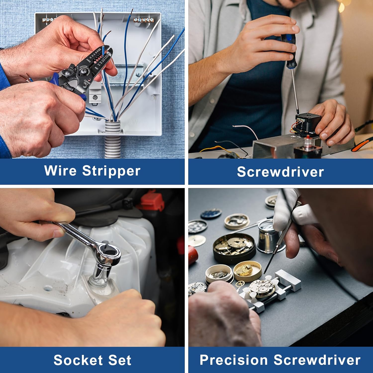【MULTI-PURPOSE HOUSEHOLD TOOLS】 This tool set for home contains the most useful hand tools for repairing or maintaining precision electronics projects and hardware upgrades. Claw hammer, hand saw, plumbing pliers,long-nose pliers, wrench, tape measure (10ft) , paper cutter, sockets, screwdriver and screwdriver bits. Perfect tool sets for homeowners: tightening screws, assembling furniture, putting up curtain rods and so on.