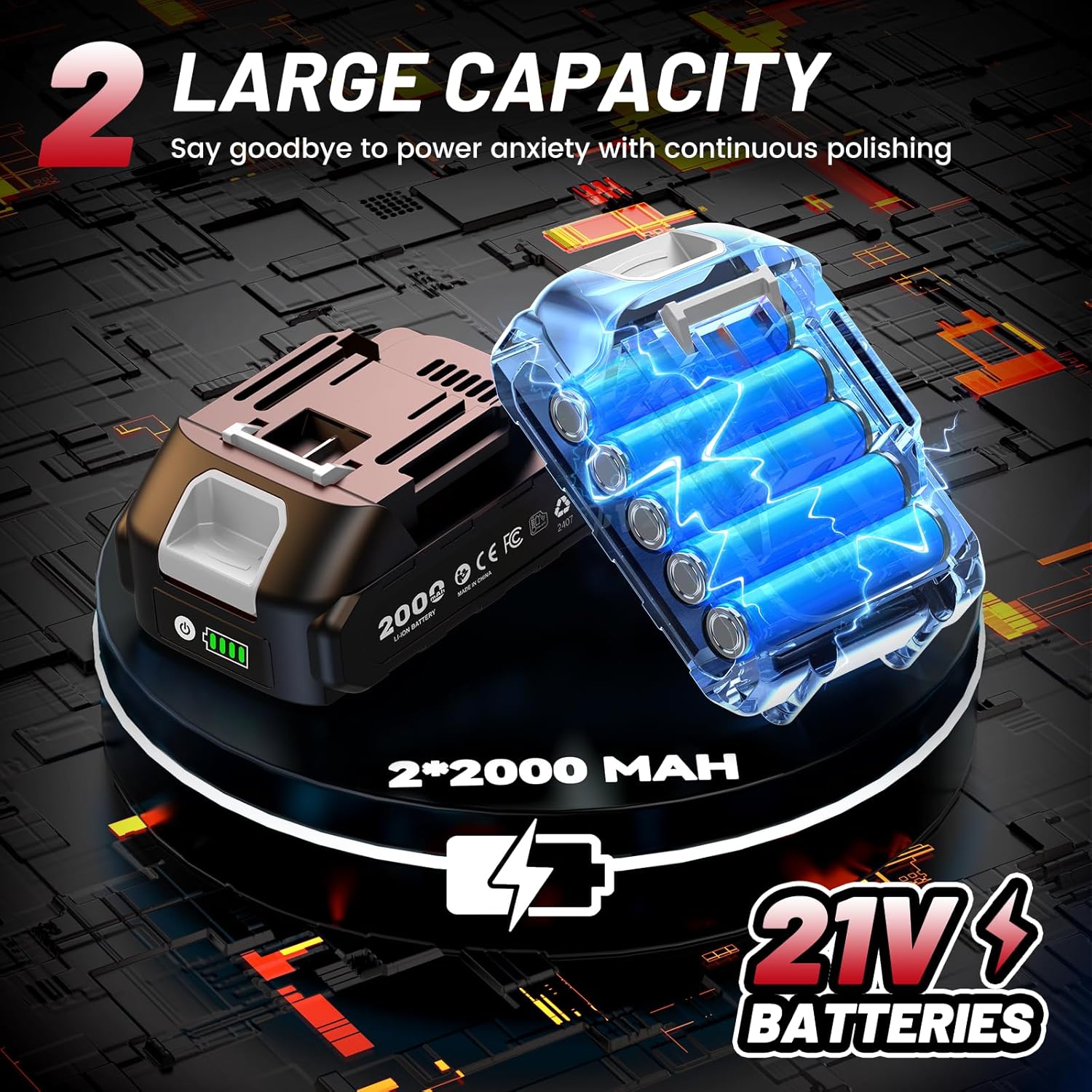 Large Capacity Battery: This polishing machine is equipped with two 21 V 2.0 Ah batteries. And equipped with a fast charger. Use two batteries alternately, no need to worry about running out of battery power, say no to battery anxiety