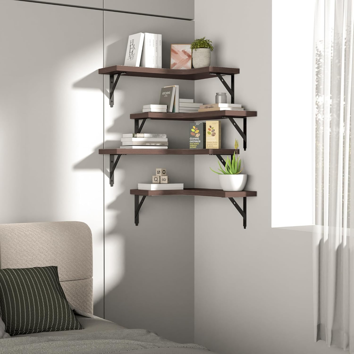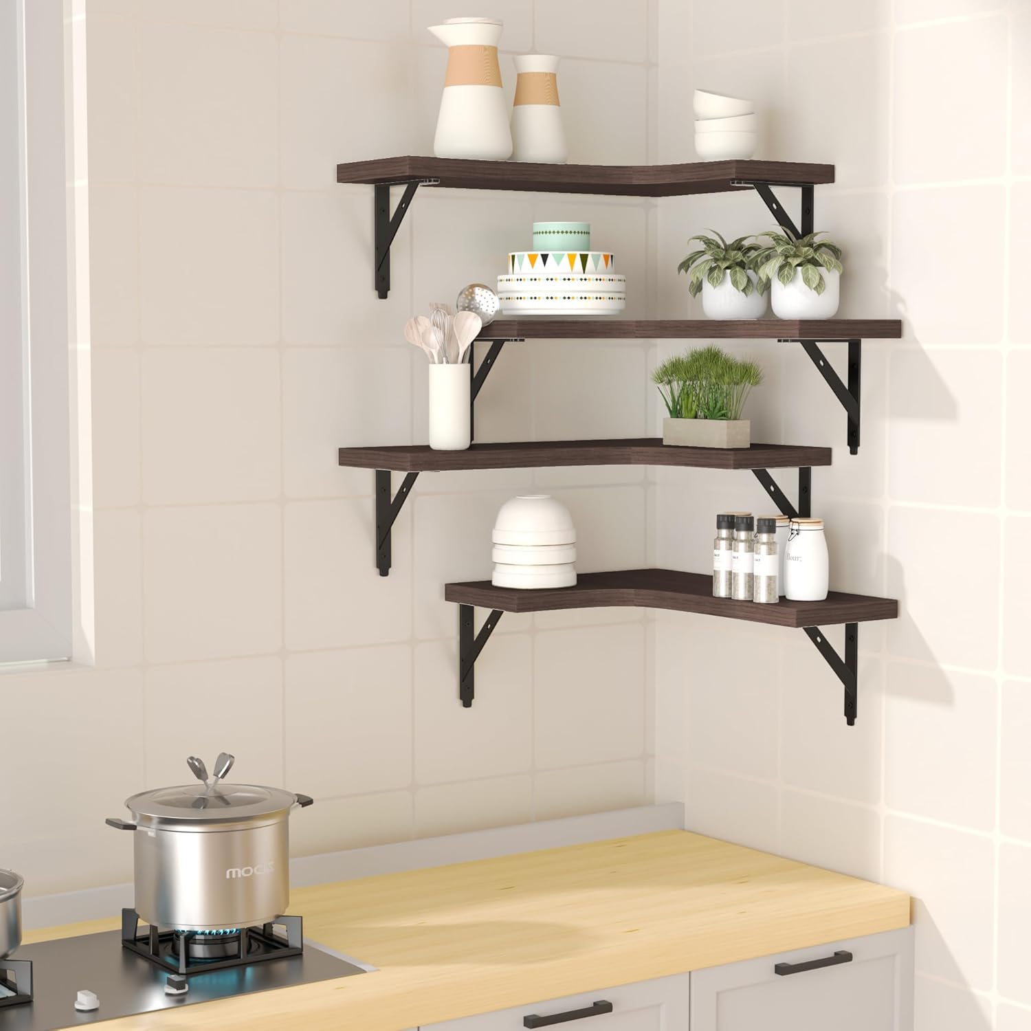Corner Floating Shelves Wall Mounted Set of 4, Rustic Wood Storage Display Wall Shelves for Home Decor, Bathroom, Kitchen, Bedroom, Living Room, Office (Brown)