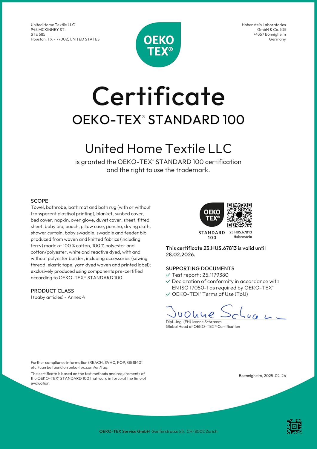 ✔ OEKO-TEX STANDARD 100 keeps you and your family safe by testing [each component of] a certified product against a list of over 1,000 harmful substances. Certificate #23.HUS.67813 by Hohenstein.