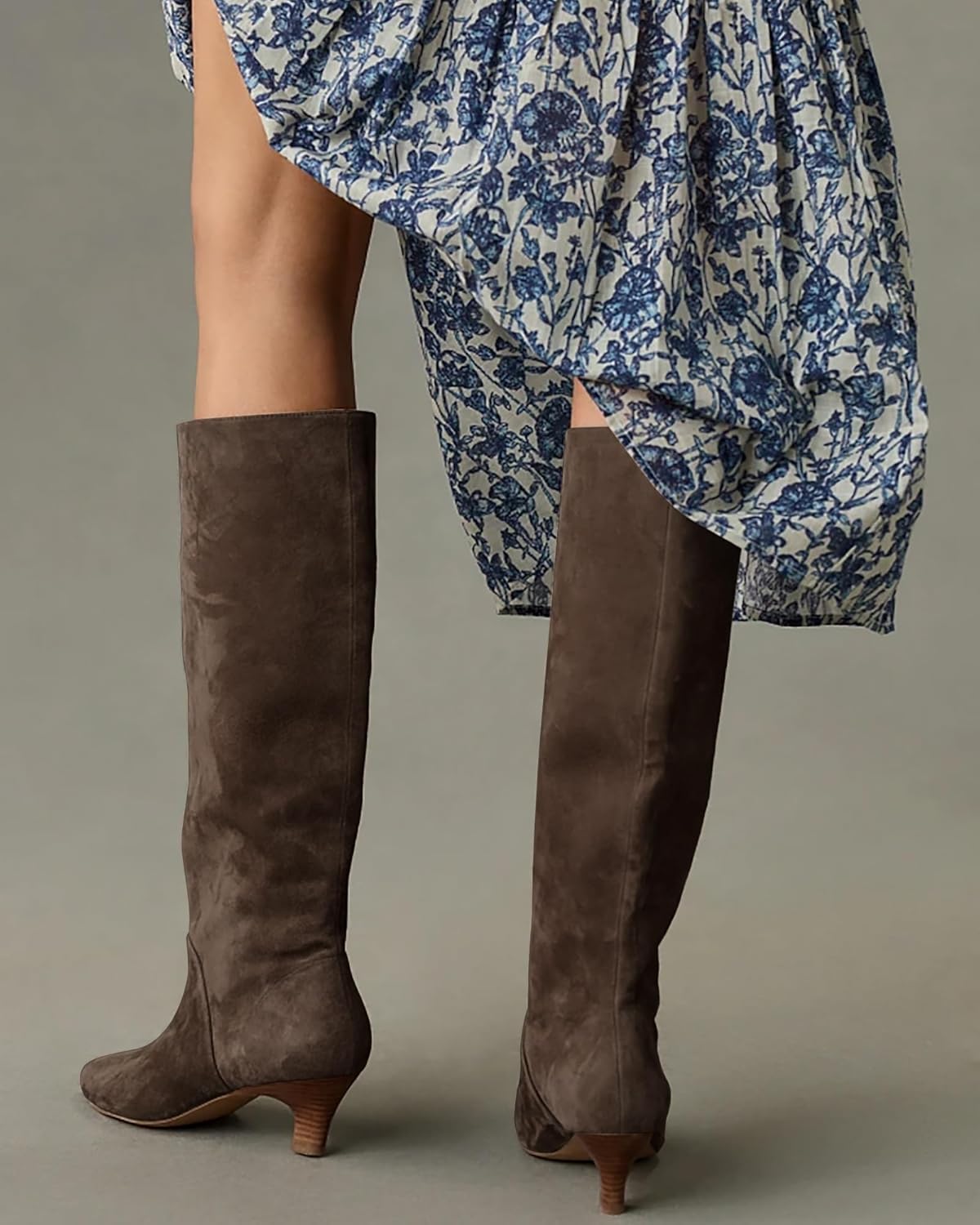 Coutgo Womens Knee High Boots Wide Calf Kitten Heel Pointed Toe Long Boots Pull On Winter Dress Shoes
