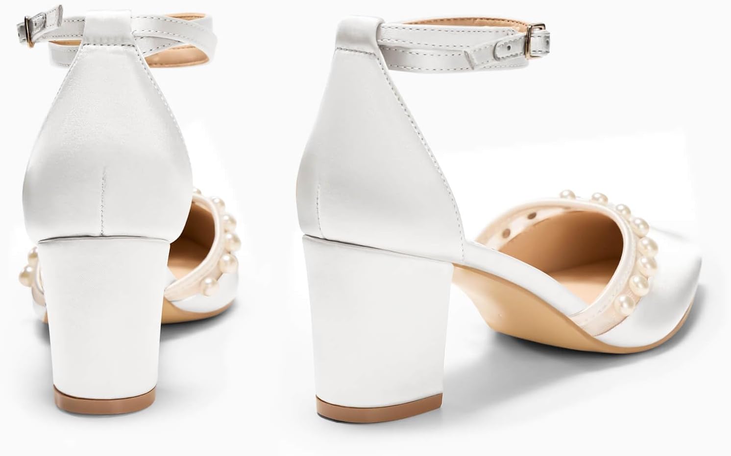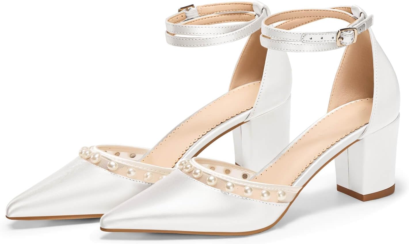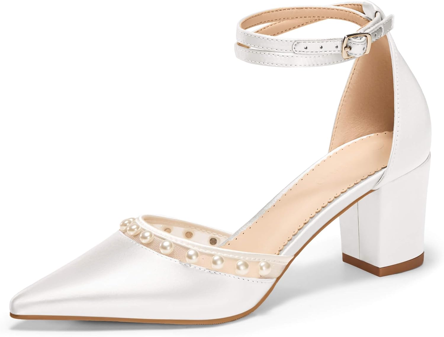 Coutgo Womens Pearl Chunky Heels Wedding Shoes for Bride Closed Pointed Toe Ankle Strap Satin Pumps