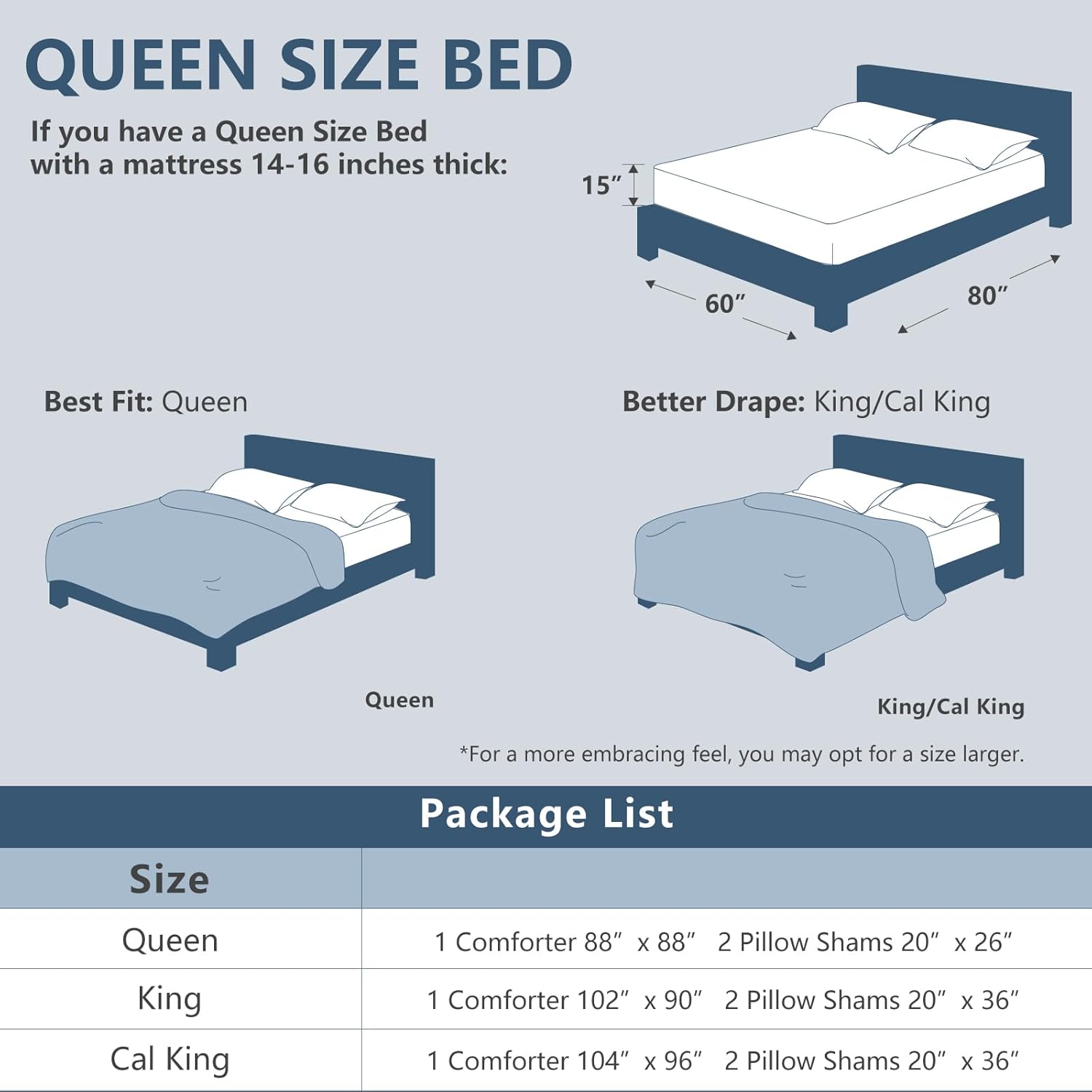 What You Can Get: Queen size comforter set includes 1 Comforter 88″x88″, 2 Pillow Shams 20″x26″; Our comforter bed set is packaged in a vacuum bag, so you can dry it in low heat or tap the comforter gently while baking it in the sun to fluffy again.