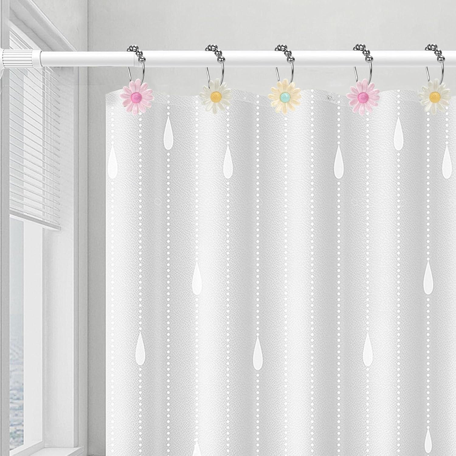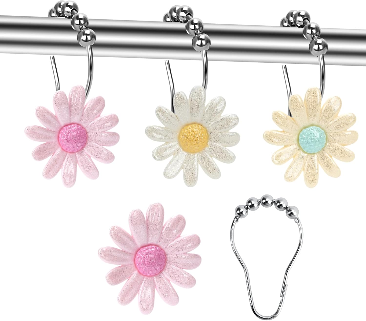 Daisy Flower Decorative Shower Curtain Hooks, Set of 12, Pink,White,Roller Ball, Stainless Steel, Flower Decor,Rustproof,Easy Install,Home & Bathroom Decor,Shower Rings