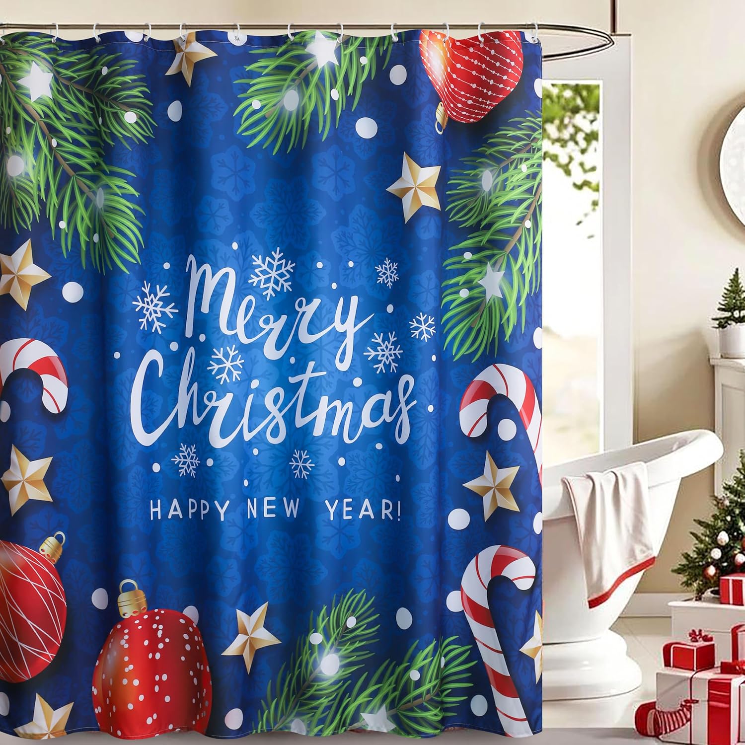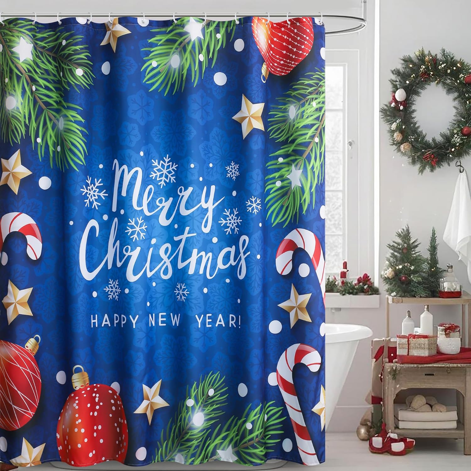 【Double Holiday Greetings】: Celebrate the season in style! Features prominent, joyful text “Merry Christmas!” and “HAPPY NEW YEAR!” alongside classic festive icons (pine, stars, snowflakes, candy canes, ornaments), bringing full holiday cheer to your bathroom decor.