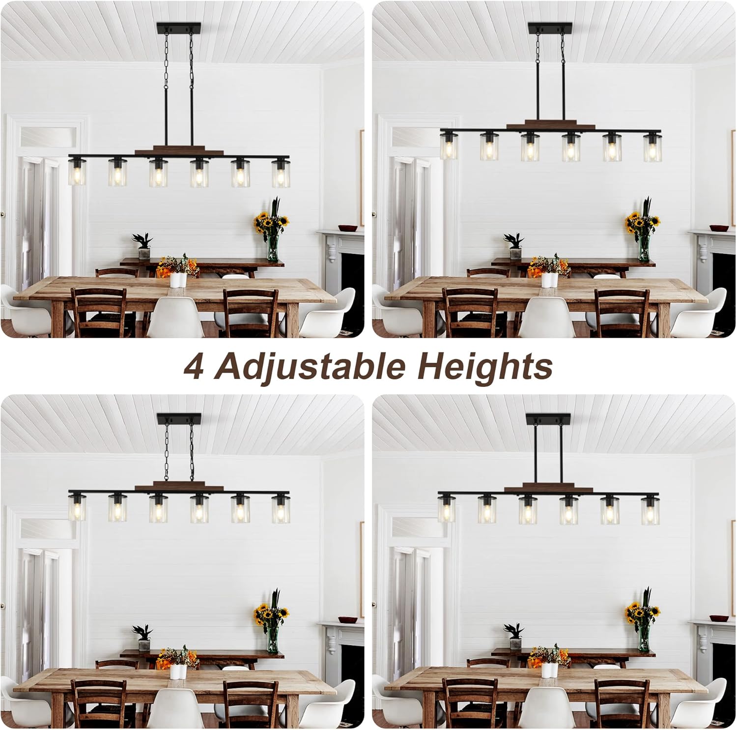 【Adjustable Height Dining Room Light Fixture】- Farmhouse chandeliers for dining room with maximum hanging length 52 inches, comes with 2pcs 11.8 inches long stems, metal chain Length: 40 inches (Adjustable), you may adjust the most suitable height as you wish, such useful design would satisfying all you needs to hang this industrial pendant light in any space no matter on low/high ceilings or sloped/vaulted/flat ceilings. dining room, restaurant and more. Perfectly fit the height of your ceiling