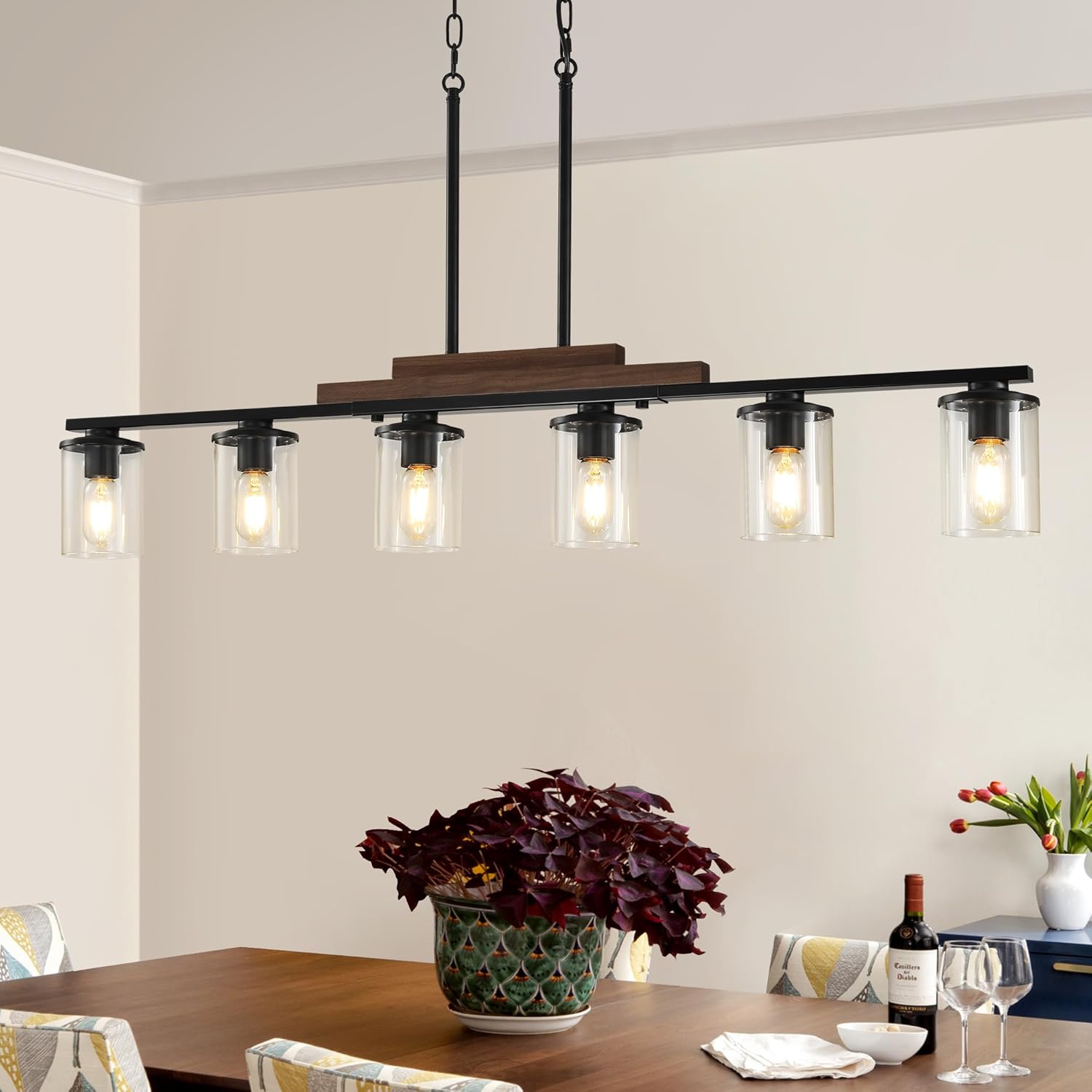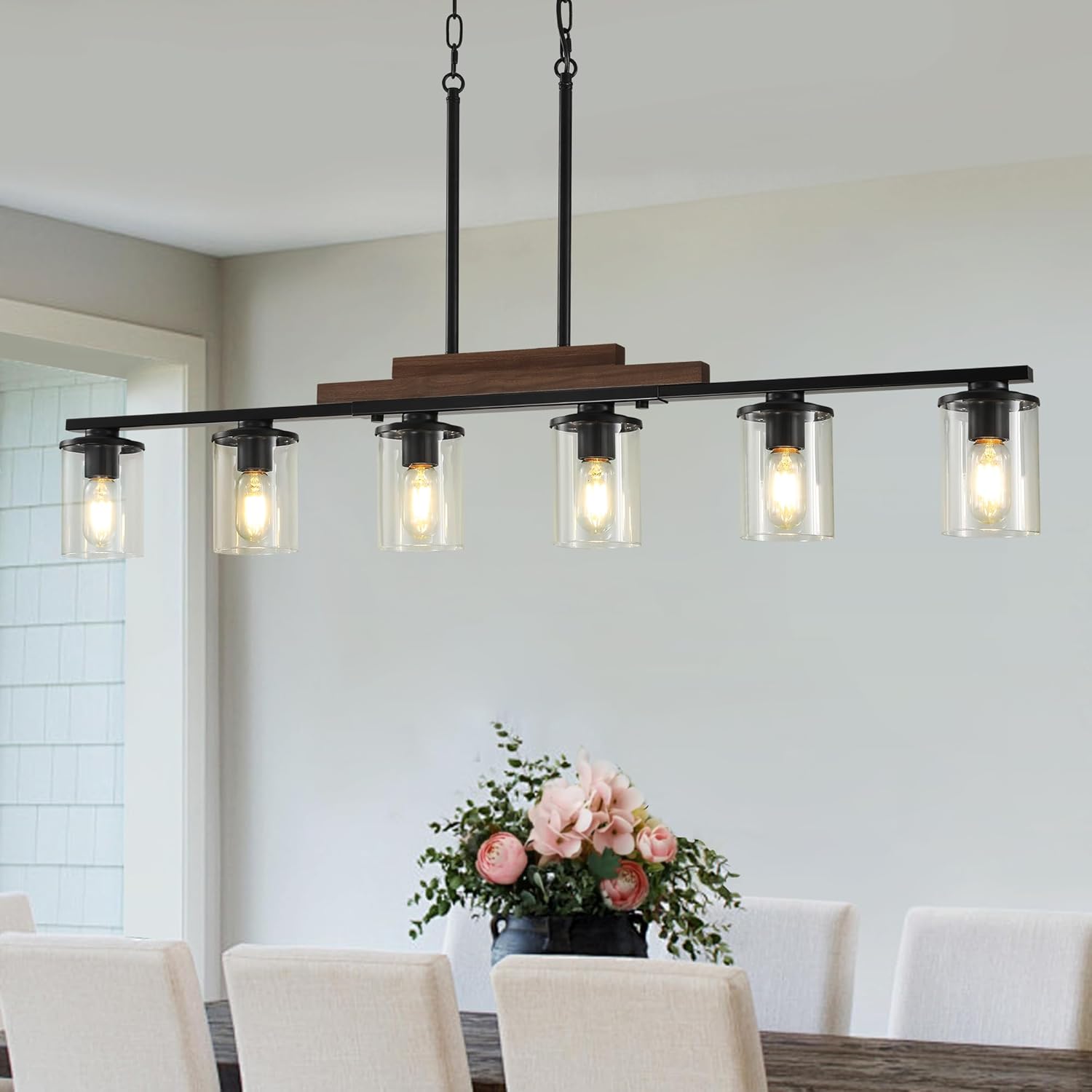 Dining Room Light Fixture Over Table, Farmhouse 6-Light Kitchen Island Lighting, Linear Black Chandelier with Clear Glass Shades, Modern Rustic Wood Pendant Kitchen Lights, with Adjustable Height