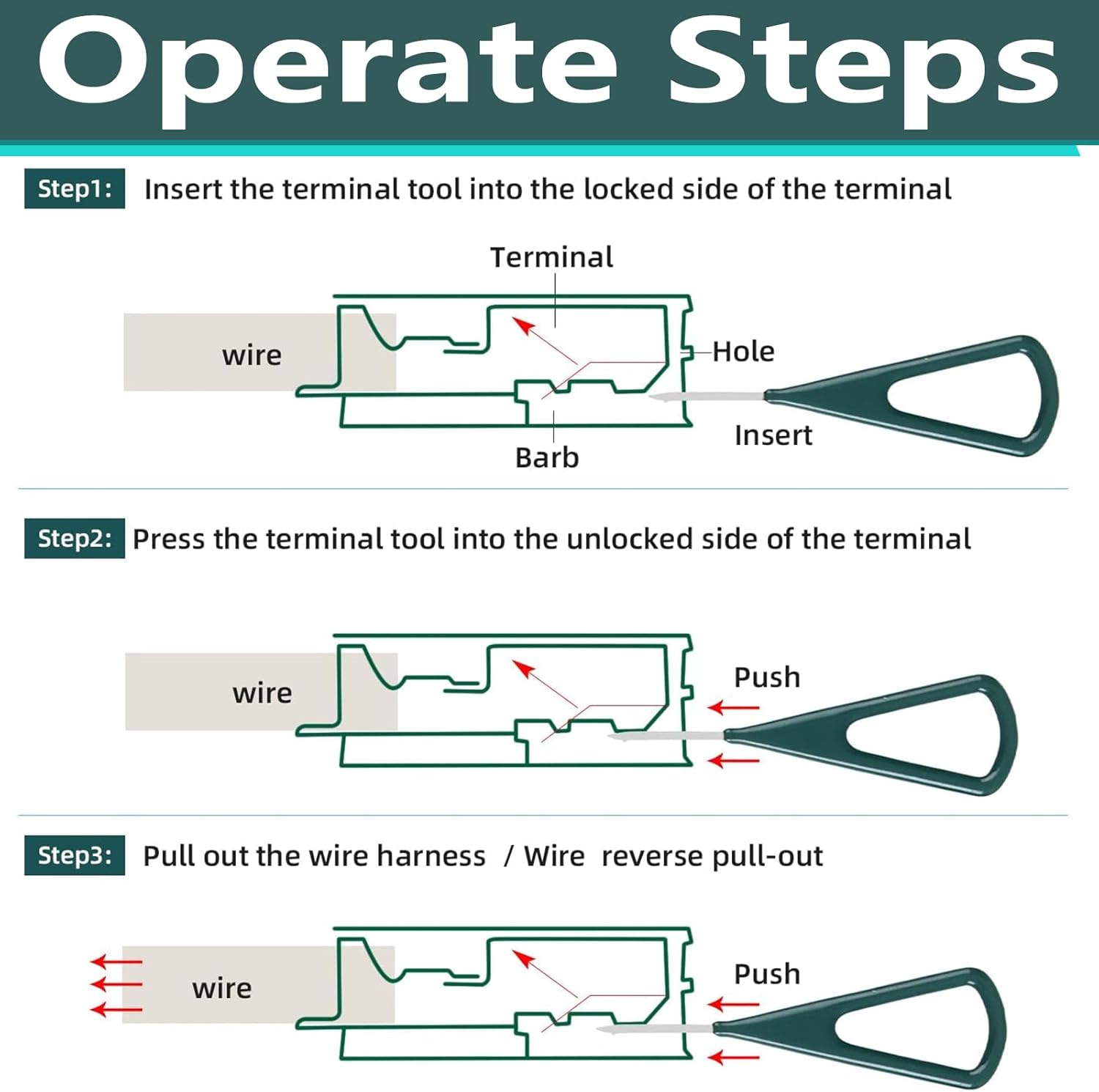 1. Insert the terminal tool into the locked side of the terminal.