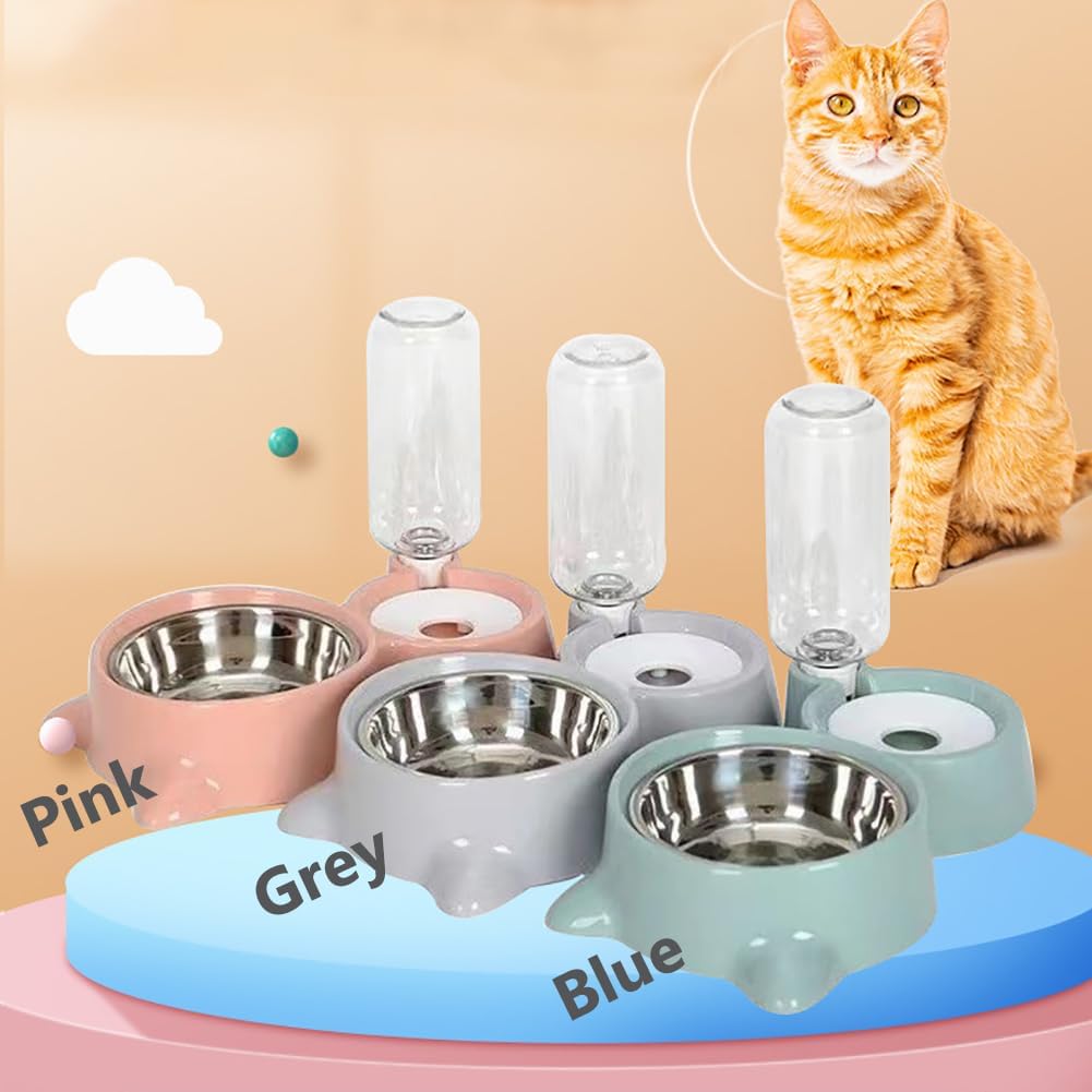 Dog Bowls, Puppy Cat Food and Water Bowl Set with Water Dispenser and Stainless Steel Bowl Detachable Gravity Pet Feeder and Waterer Set for Cats Dogs Puppy Rabbit (Grey)