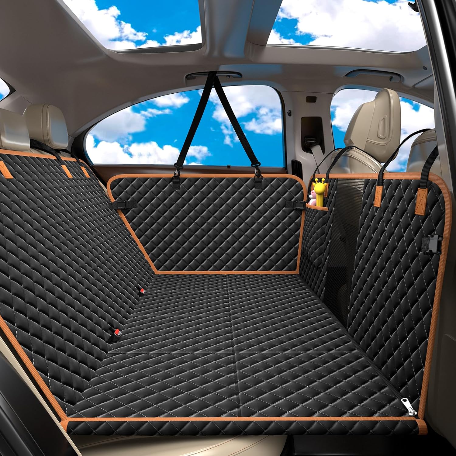 【Easy Installation】Just open the car travel cover bed and spread it to the back seats.Hang the straps on the car seat headrest poles and armrests; Buckle up all buckles. There is an additional dog car seat belt for dog safety. Just clip the buckle into pet’s choker and fasten the other one into seat buckle.