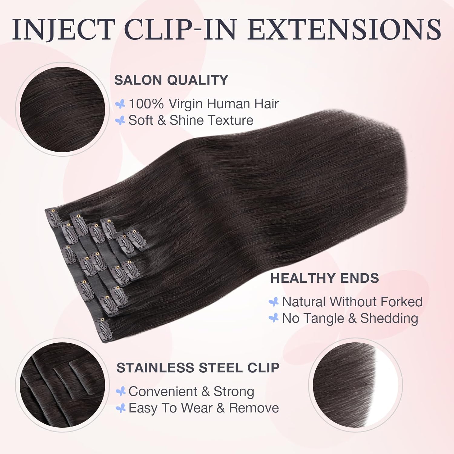 Durable Clip in Human Hair Extensions: Strong stainless steel clips are not easy to fall off, invisible design is comfortable to wear, protects scalp and hair, creates a natural look. Easy to install, remove and reuse