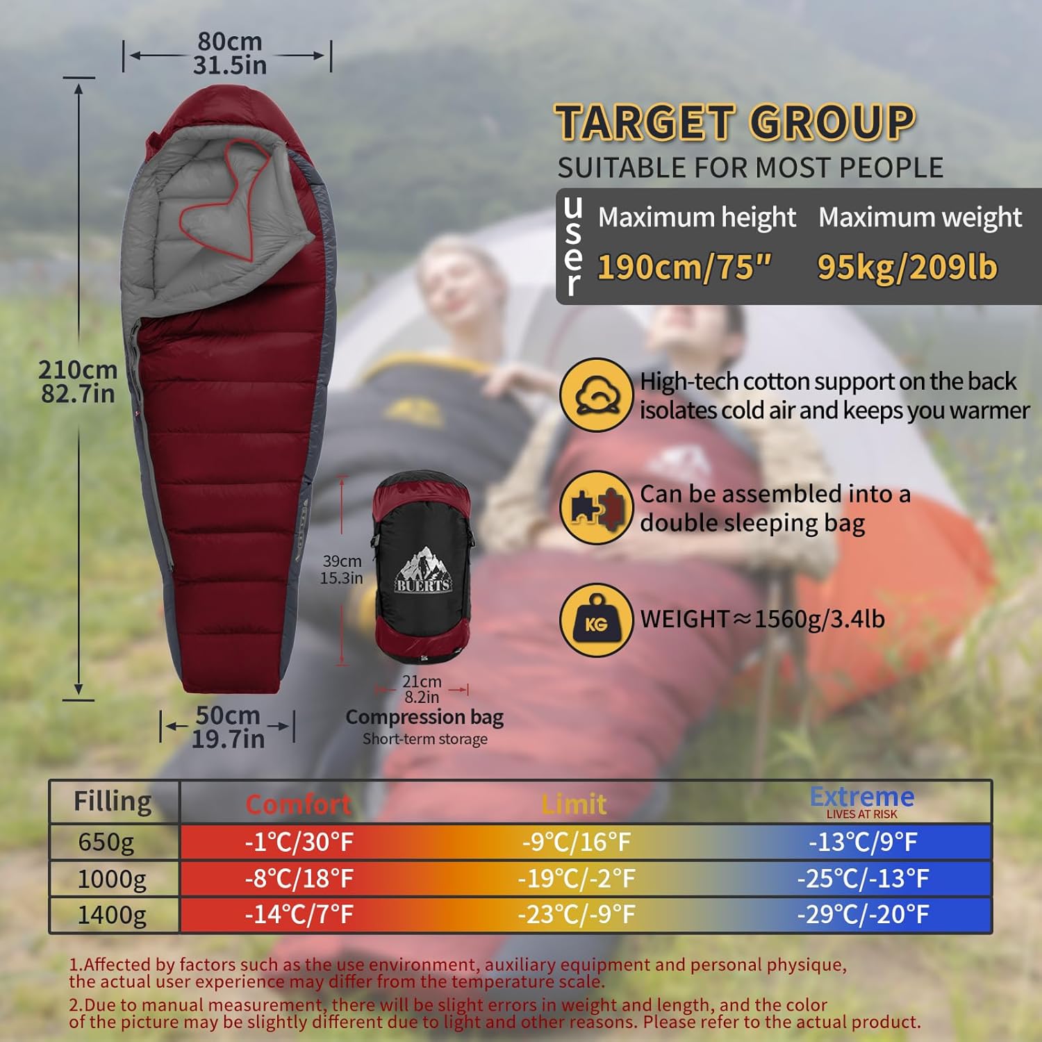 Special Design: This adult sleeping bag is filled with 3.5 oz (approximately 0.4 in thick) of insulation per 10 square feet, from shoulders to feet. Even when the down loses some of its loft and warmth due to your body weight, it still locks in heat, preventing heat loss from your back and enhancing comfort for extended periods. This makes it ideal for outdoor activities and hiking, ensuring a sound sleep even in the wilderness and rainforest.