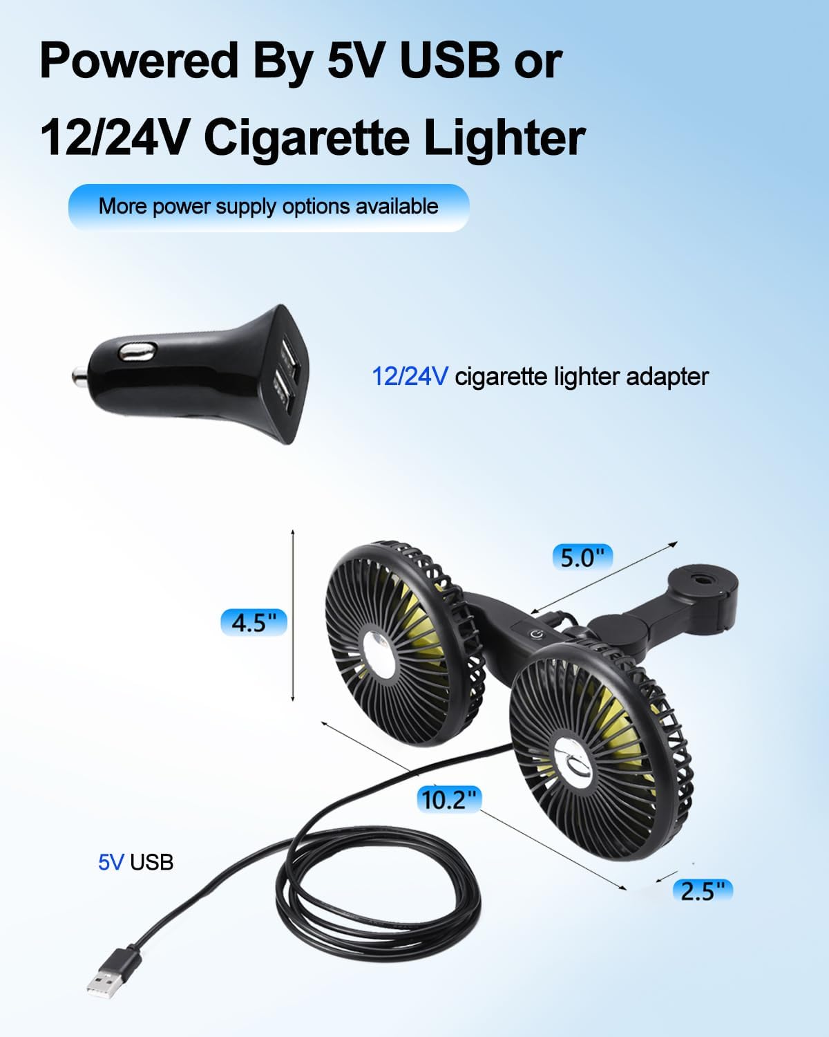【USB or Rechargeable Battery Operated】 The DICMKY dual head fan has a 2000 mAh battery that can last from 2.5/4.5/9 hours(Depending on speeds), also it can be used while charging. The 5V/2A USB powered auto fan is compatible with various devices, including power banks, car chargers, laptops, computers, and AC adapters. The car fan with extended 70 inches cord, is long enough to easily plug into USB devices