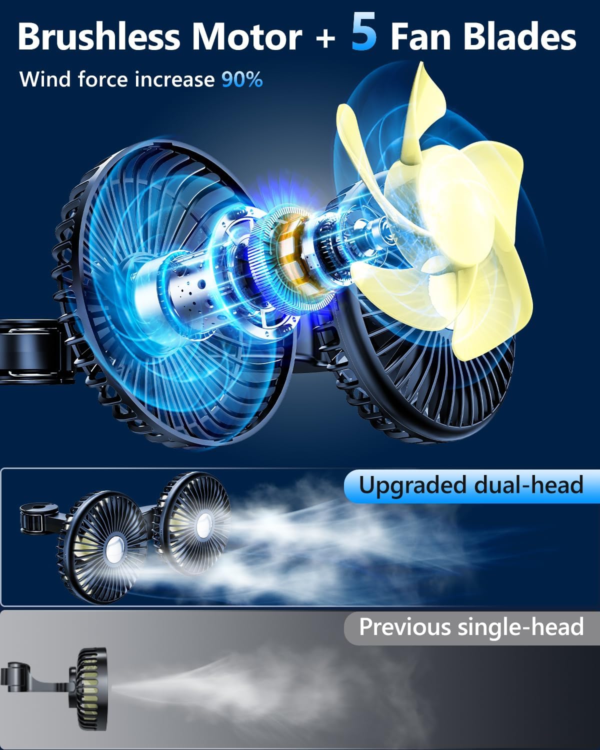 【Double Coolness】 The DICMKY dual head car fans utilize 5-blade vortex type wind gathering technology to create a stronger and steadier stream of cool air. Powered by a brushless motor and the fan spindle is made of 100% pure copper, the mini fan for car delivers powerful and consistent airflow, maintaining noise levels under 30dB. Its quiet operation ensures minimal disturbance, making it ideal for long drives or road trips with family and friends in hot summer.