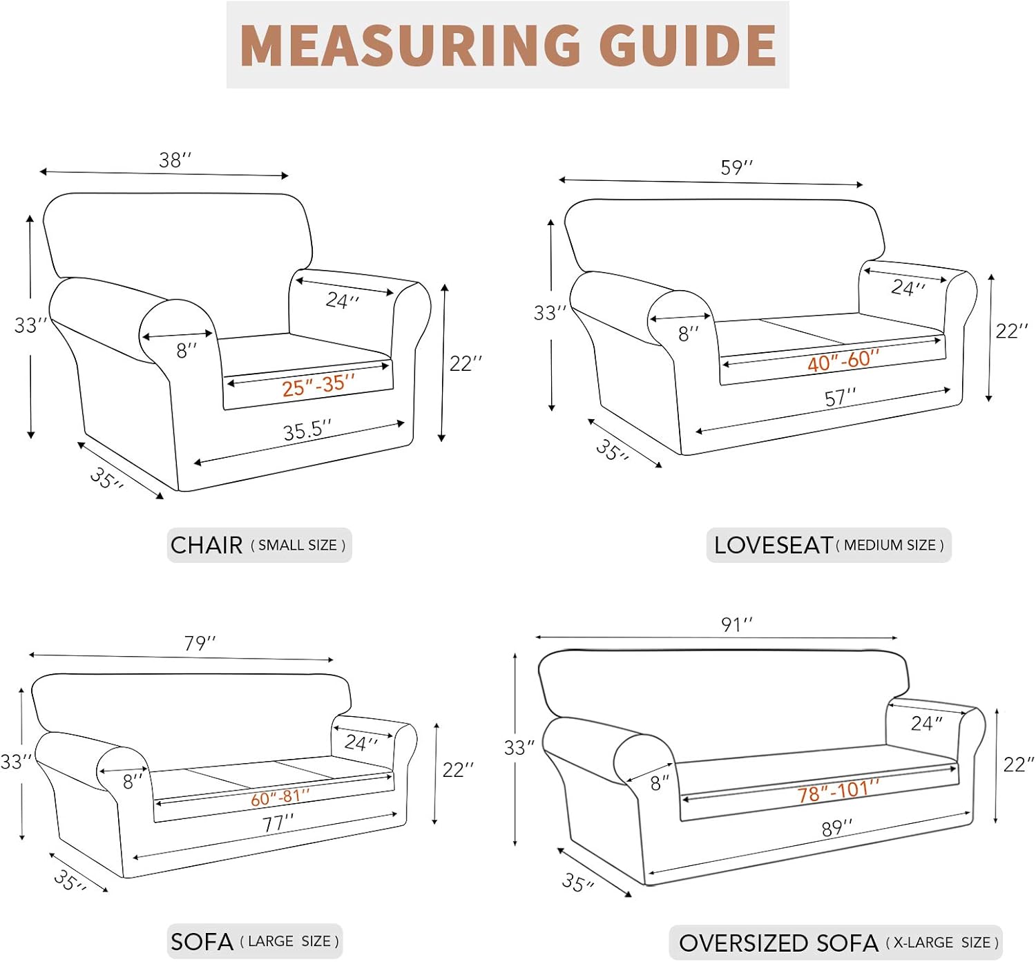 Perfect Fit: Sofa cover fits seat width (60″- 81″). Detailed measurement please refer to size picture. Be sure to measure the sofa before purchase. Elastic Bottom can provide all round protection for the sofa, protecting from stain, spill, daily wears and tears.
