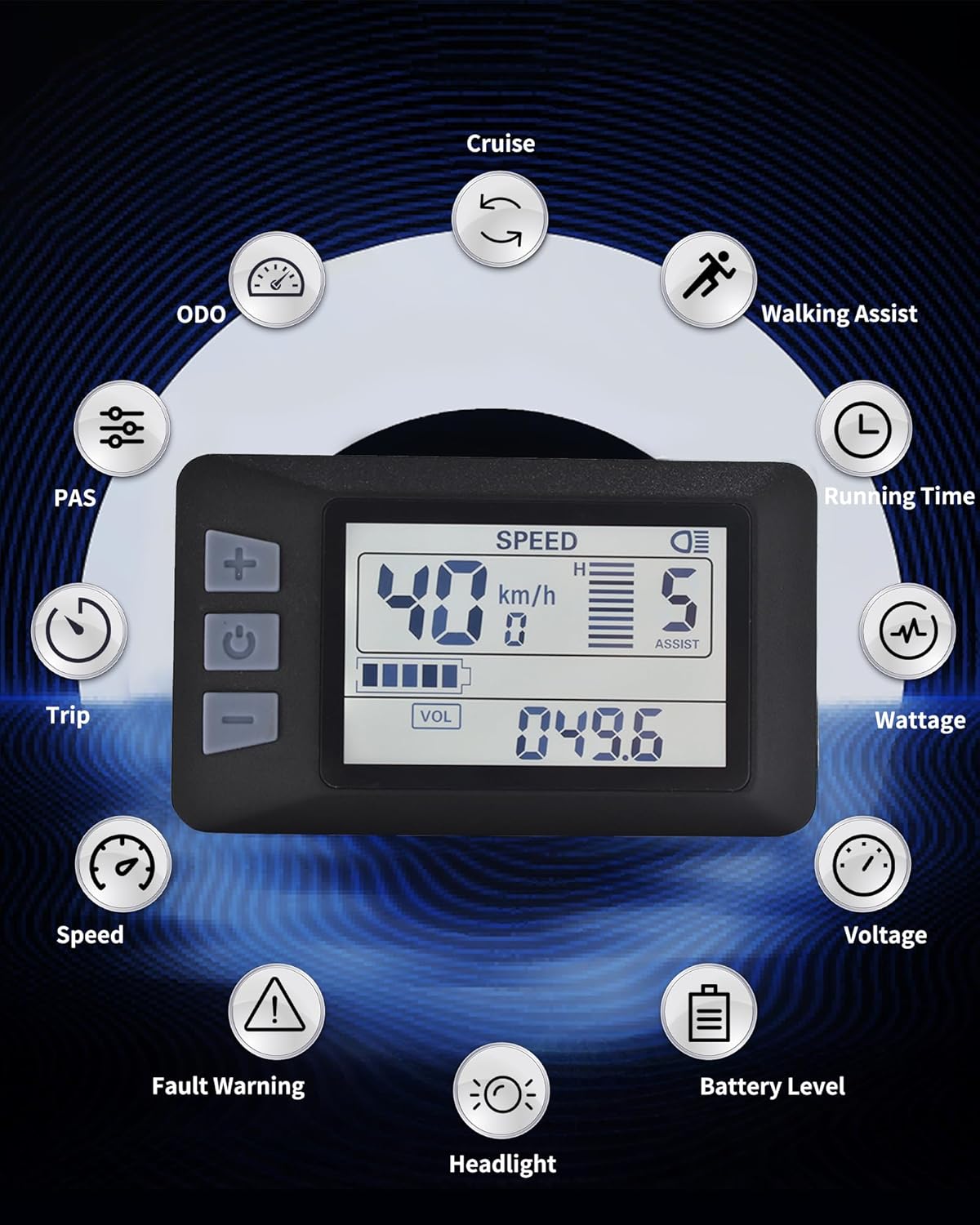 [Personalized Control]: Take charge of your ride with the versatile features of our cycling computer, including a vibrant screen, walk-assist mode, cruise control, real-time trip and total mileage tracking, voltage display, and the ability to modify key bike parameters such as wheel diameter and speed limits.
