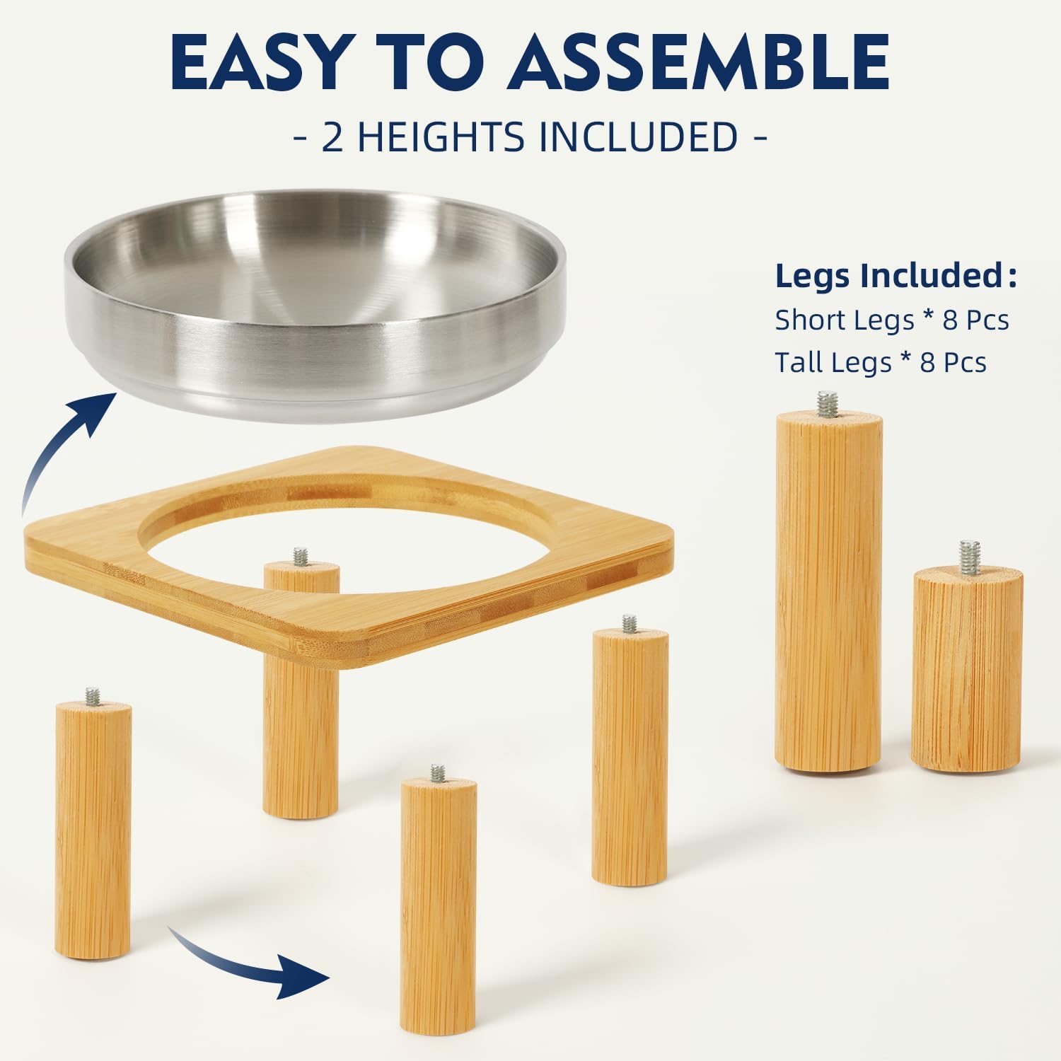 【STURDY CAT FOOD TABLE WITH 4-LEG SQUARE DESIGN】Unlike typical elevated cat bowls with unstable frames, our raised cat bowl set features a square bamboo cat food table with four solid legs for enhanced stability. This thoughtful design helps prevent tipping and sliding, making it perfect for cat bowls for indoor cats.
