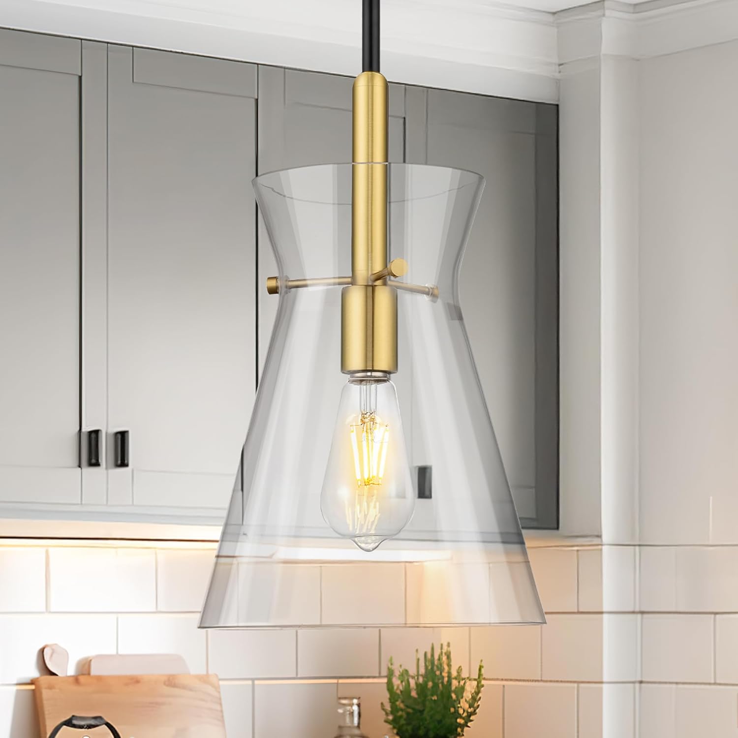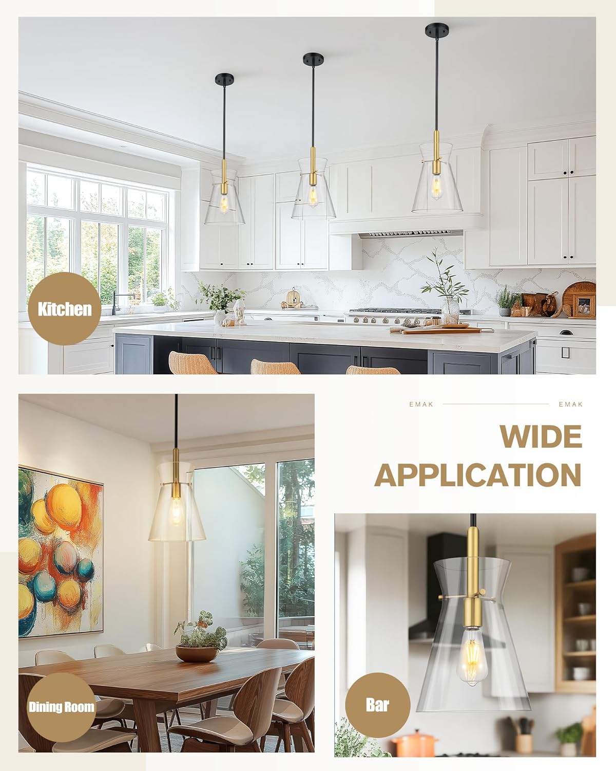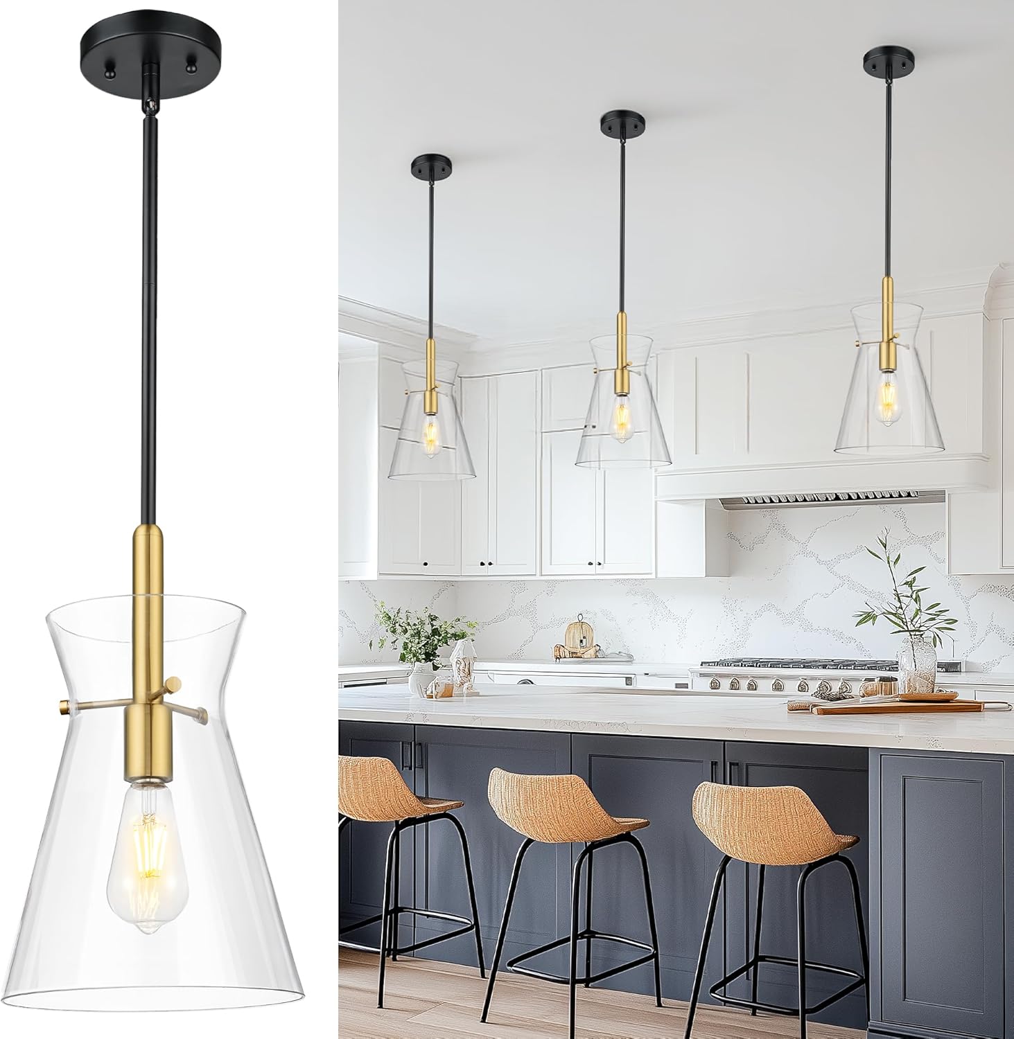 [Modern Elegance] EMAK 9-inch black gold pendant lights kitchen island showcases a sleek hand-blown shade that delivers clean, direct illumination. The transparent finish and minimalist funnel shape add a crisp modern touch