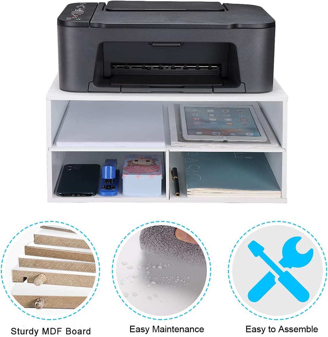 【Multi-Purpose Office Solution】Functions as printer stand, monitor riser, paper organizer, and general desktop organizer. Durable, easy-to-clean surface withstands daily use in home, office, or educational environments.