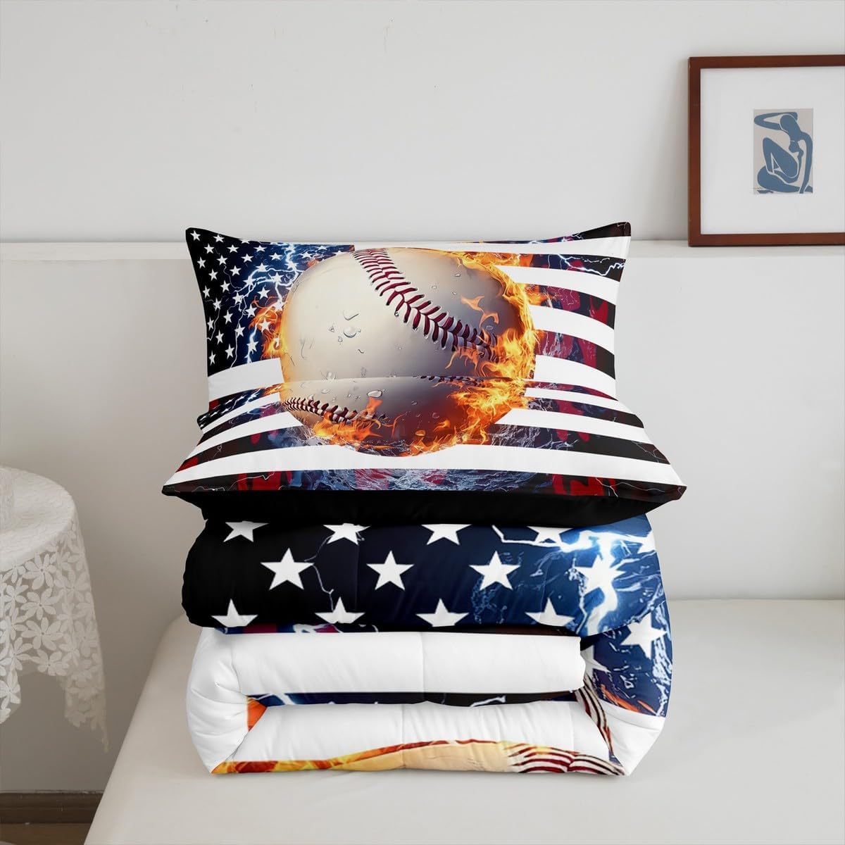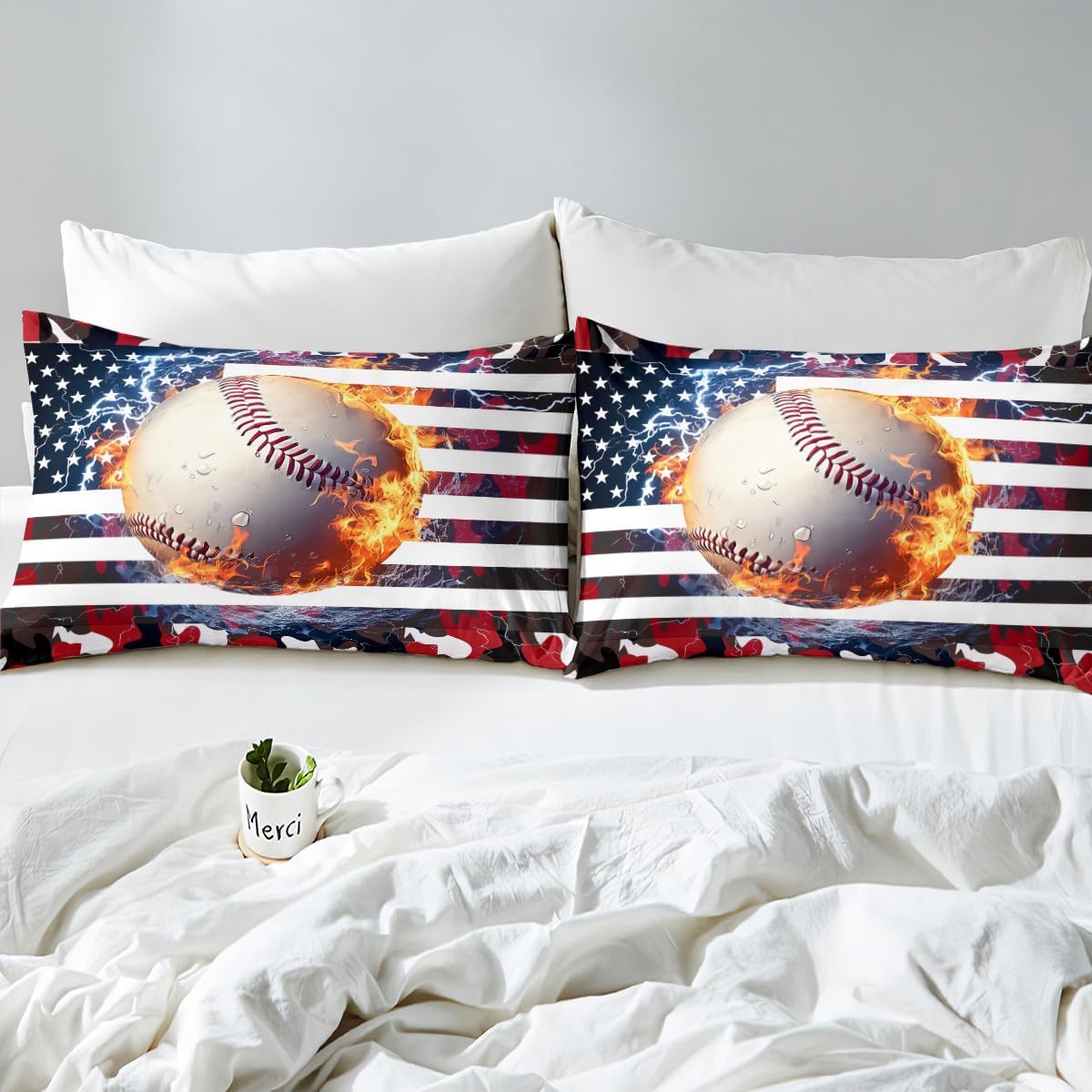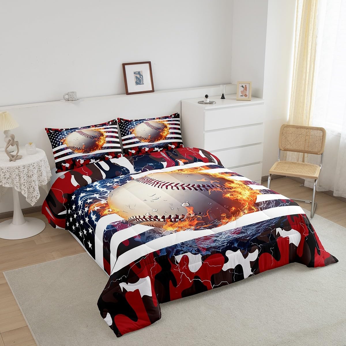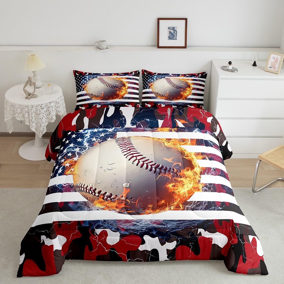Erosebridal Baseball Comforter Set, Twin Size, Boys American Flag Quilted Duvet Camouflage Bedding for Kids Teens Adult Men, USA Federations Stars Duvet Set, Black and Red Bedroom Decor