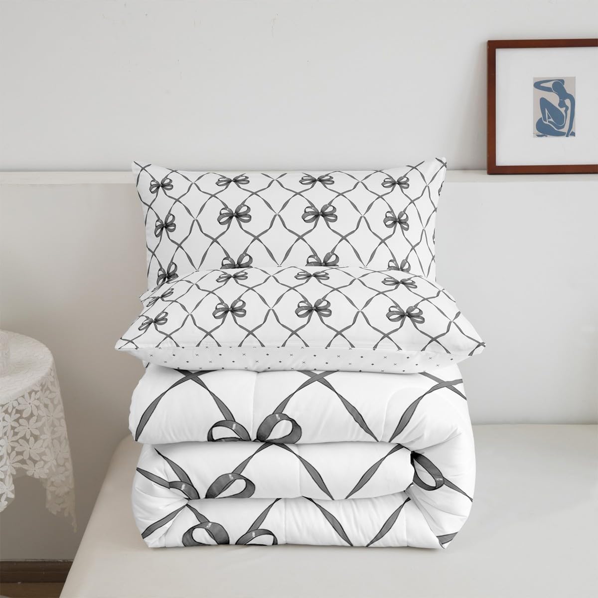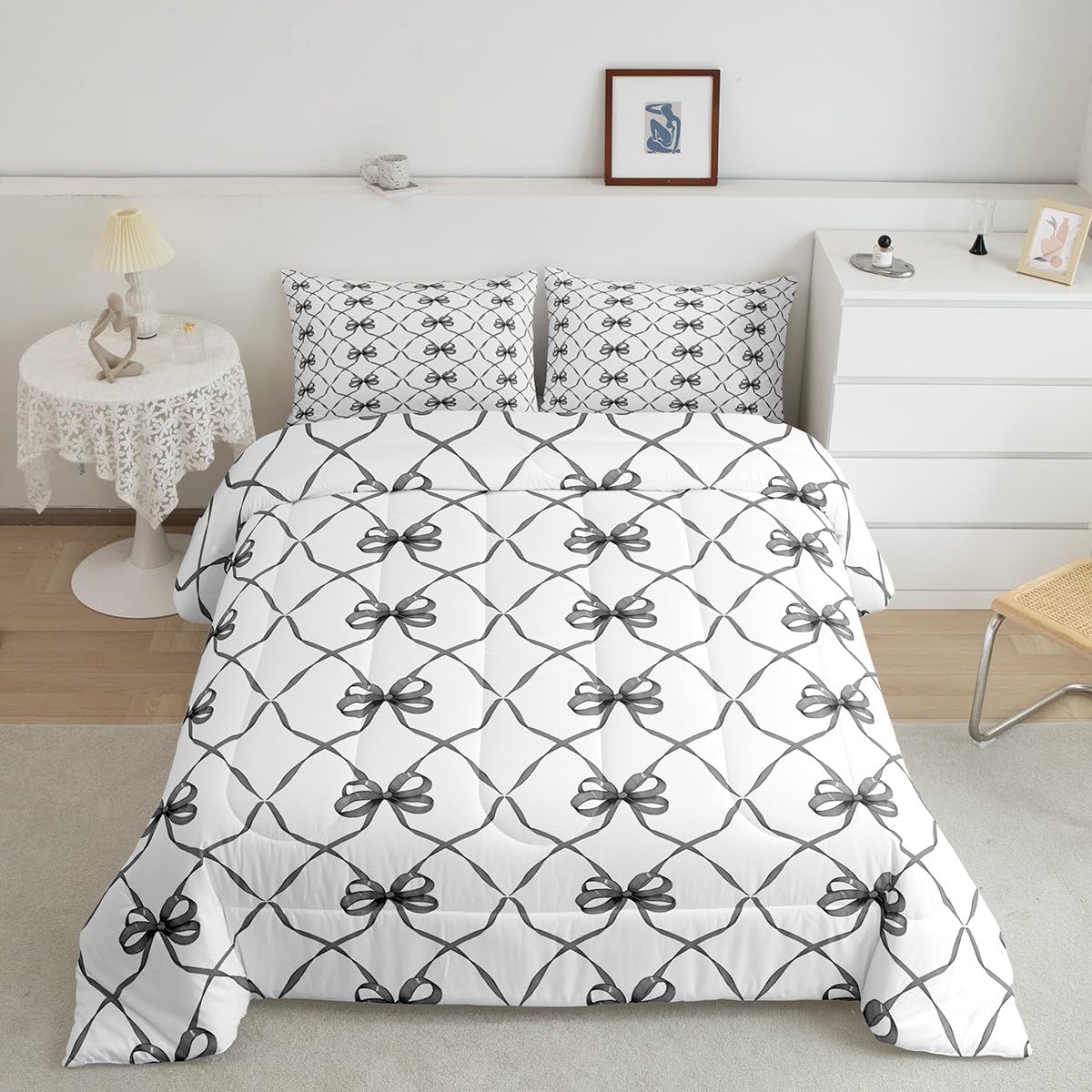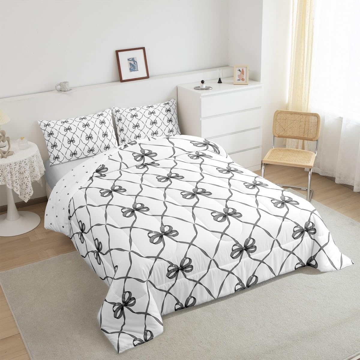 Erosebridal Bowknot Comforter Set King Bow Knot Bedding for Kids Butterfly Knot Bow Tie Bedding Comforter Sets Aesthetic Coquette Bedroom Decor Geometric Cartoon Black Grey Duvet Insert