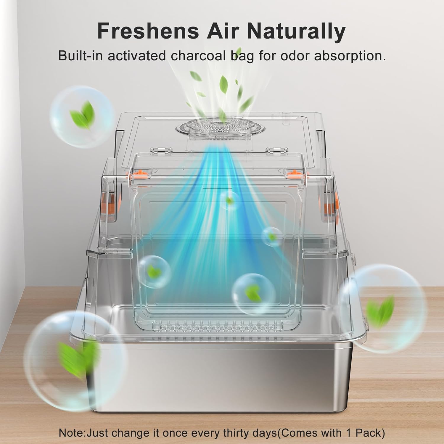 ODOR-FIGHTING CARBON ZONE:The top of this stainless steel cat litter box with lid has a dedicated area for charcoal bags to neutralize ammonia smells. (Note: Change bags once every 15 days – Comes with 1 Pack). A must-have feature for any enclosed stainless steel litter box.