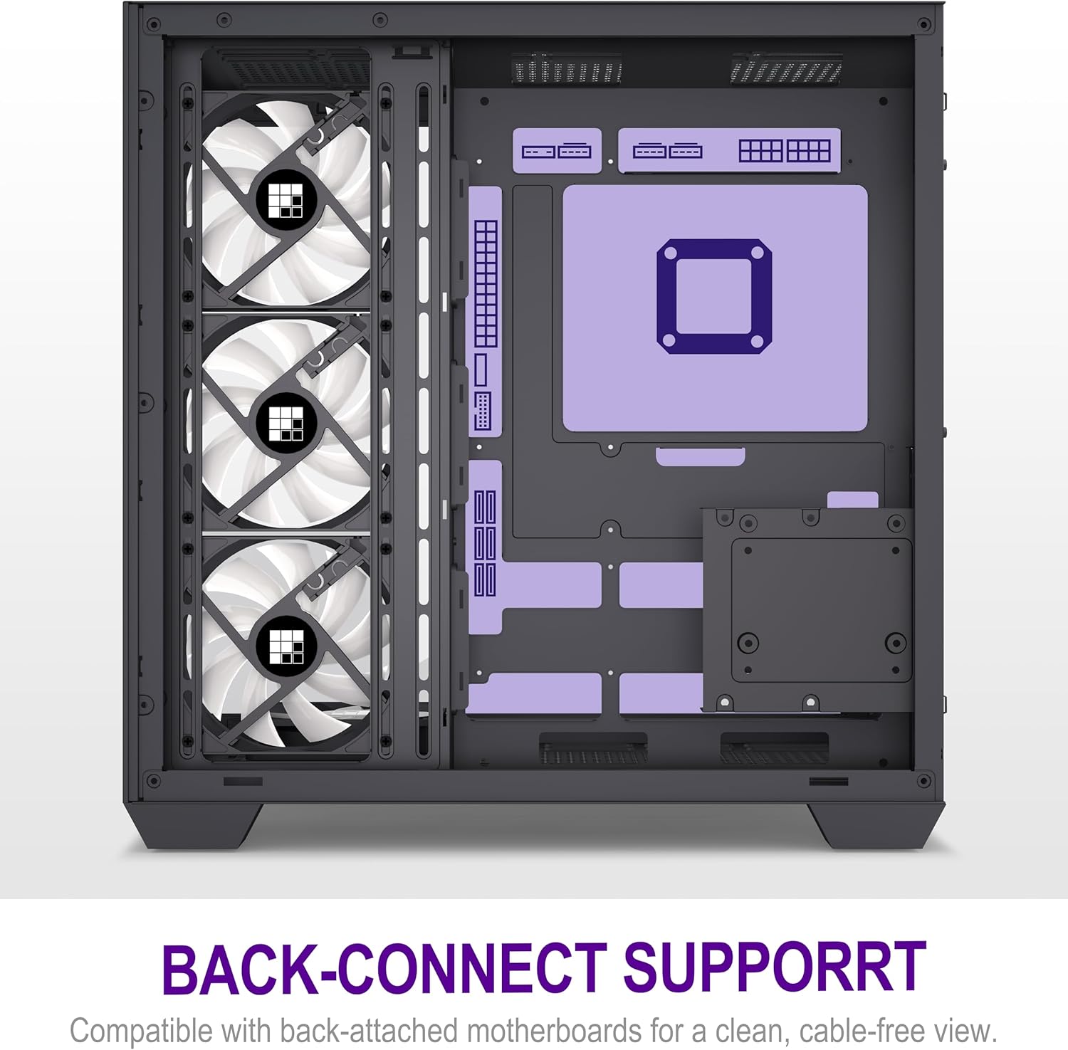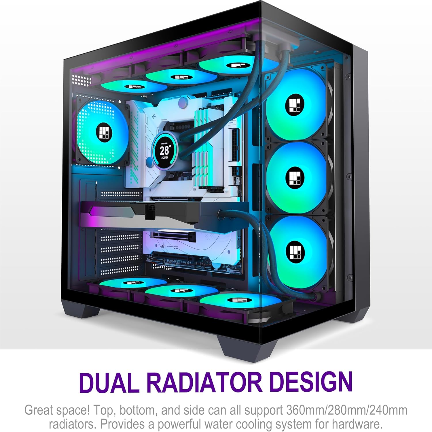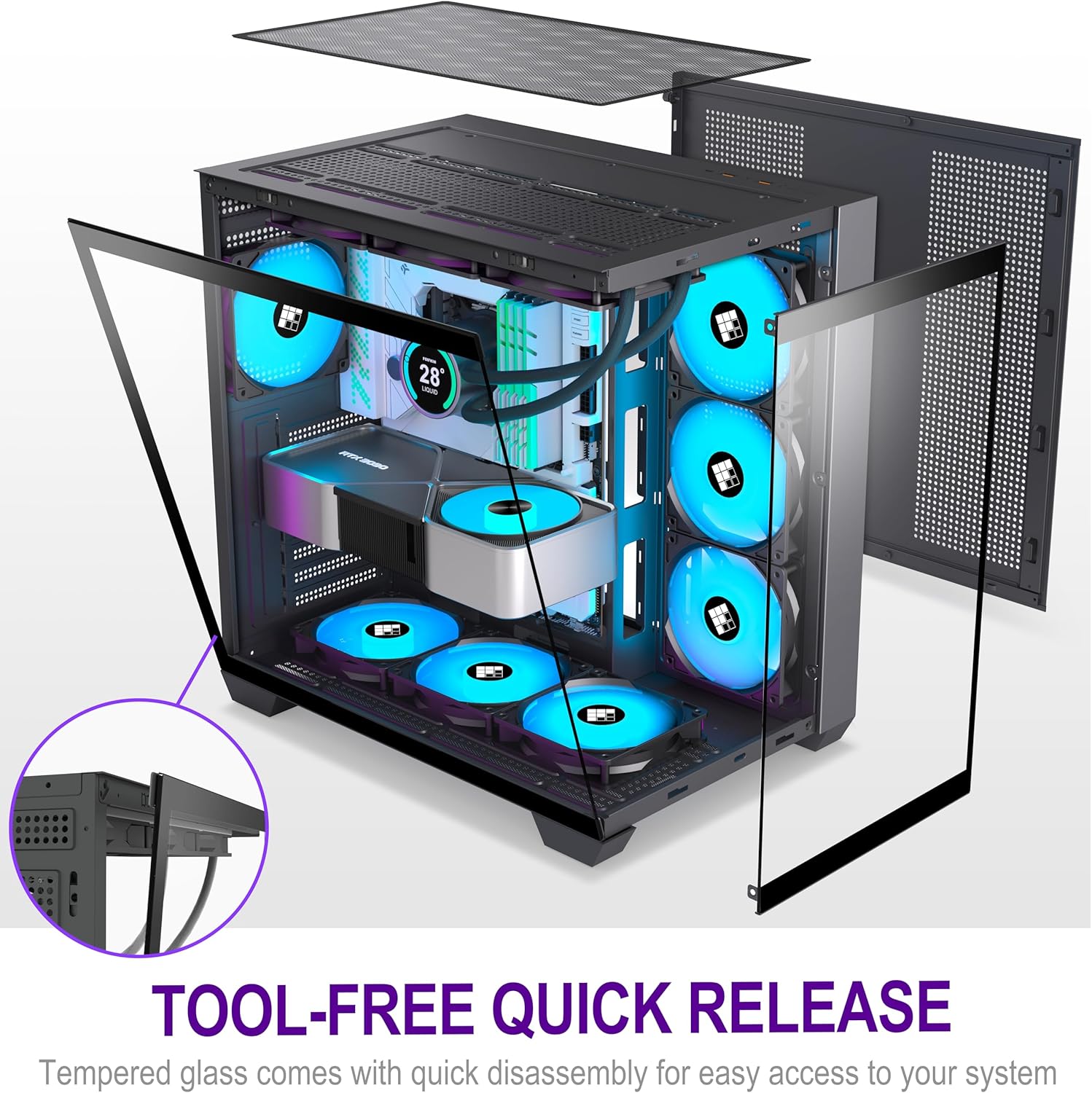 【High Performance Cooling】F600 is pre-installed with 7 ARGB PWM reverse fans, and the glass side panel adopts a hinged design, which can be quickly removed without tools, bringing convenient installation and heat dissipation experience. Up to 10 120mm fans can be accommodated on the sides, tops, and PSU fan mounting points of your computer case, ensuring that you don’t sacrifice cooling for the stunning appearance of the glass panel.