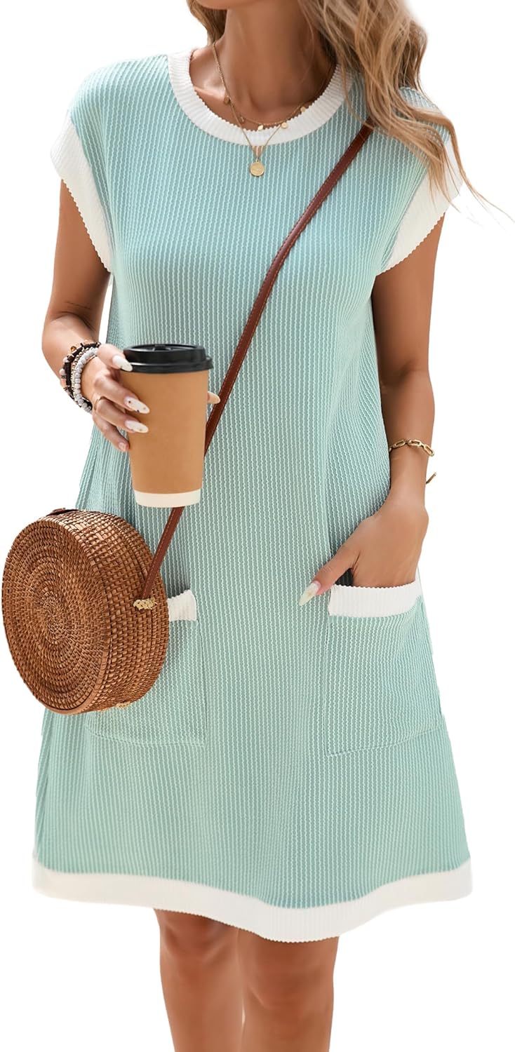 Women’s Casual T Shirt Dress Ribbed Crew Neck Pullover Cap Sleeve Patch Pockets