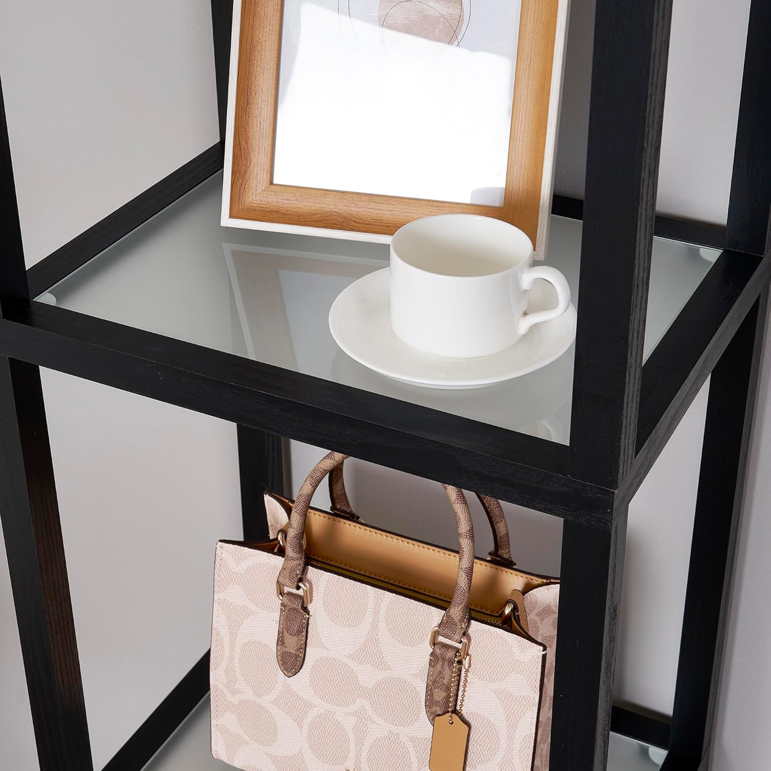 Tempered glass shelves offer clear, open storage without bulk – This glass shelf lamp features four sturdy tiers—perfect for books, plants, or collectibles. Use it as a curio-style corner shelf or lighted side table to elevate your space with minimalist design.