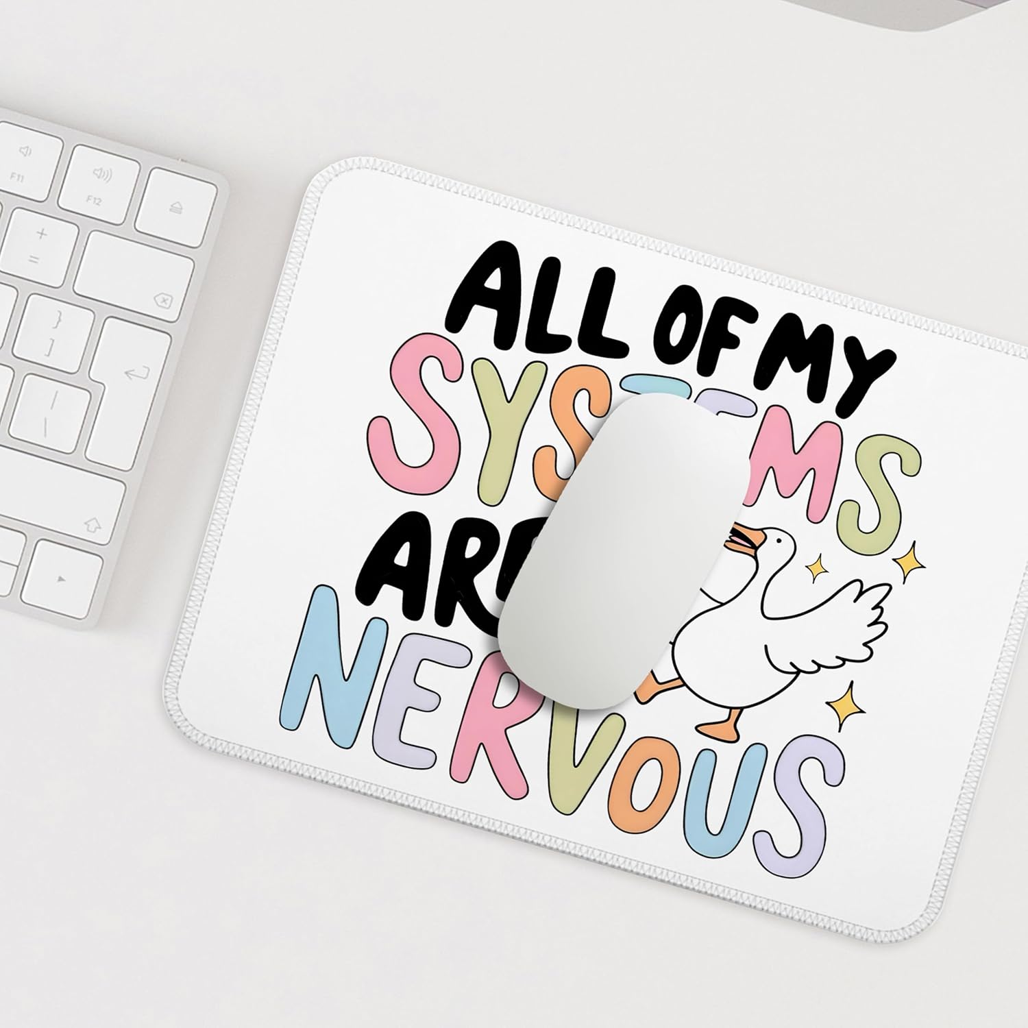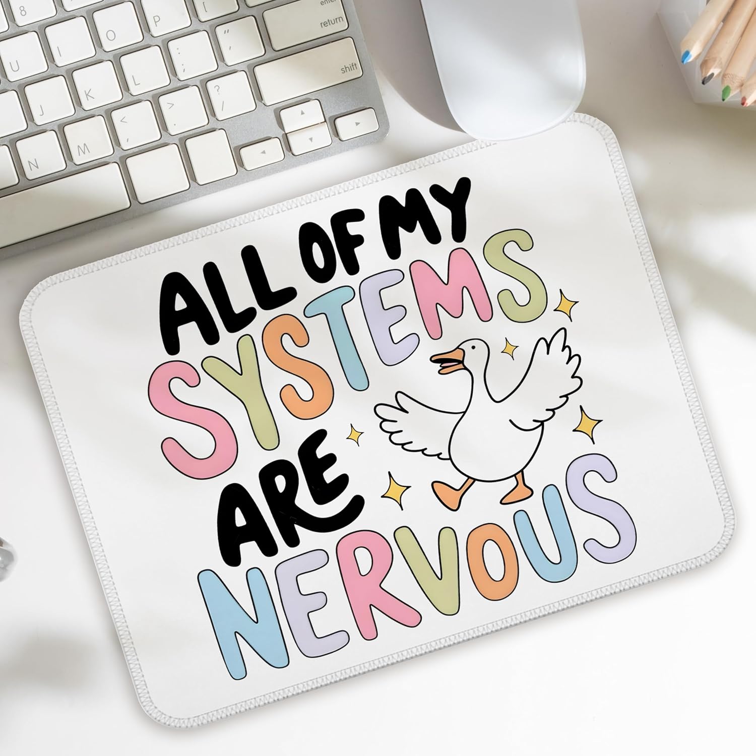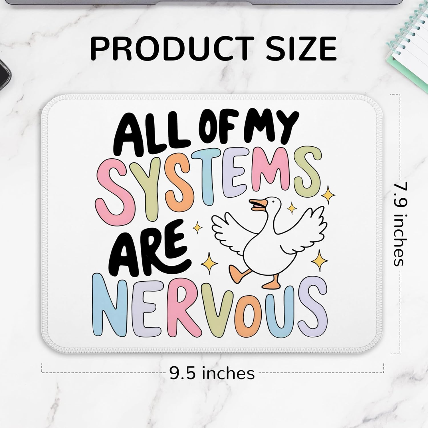 Let this silly goose bring some levity to your hectic days! The FGFK “All of My Systems Are Nervous” Funny Silly Goose Meme Mouse Pad combines adorable humor with mental health awareness, creating a relatable and funny workspace vibe. Sized at 9.5×7.9 inches, it’s perfect for wireless mice, laptops, and desktops — a daily reminder to laugh through the nerves.