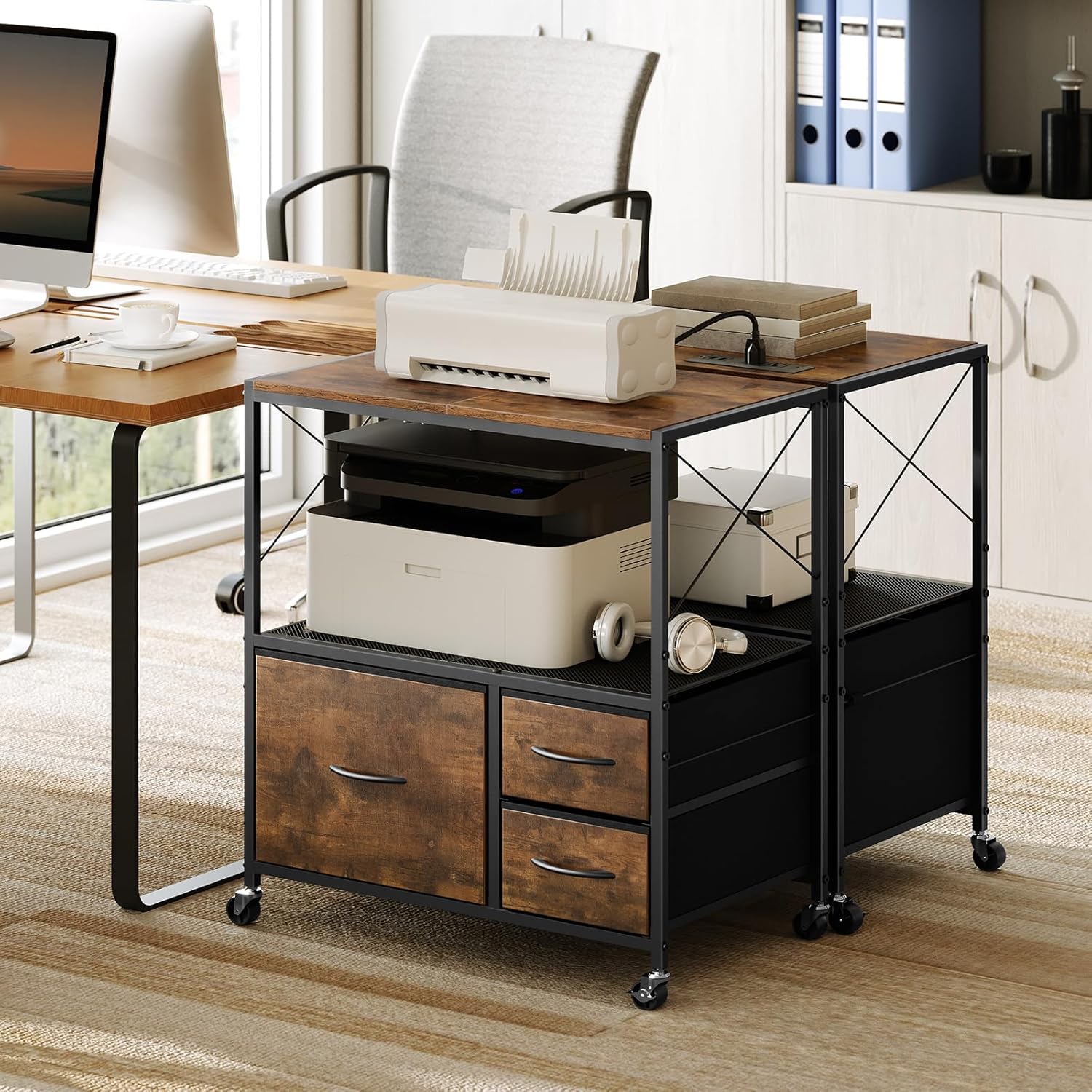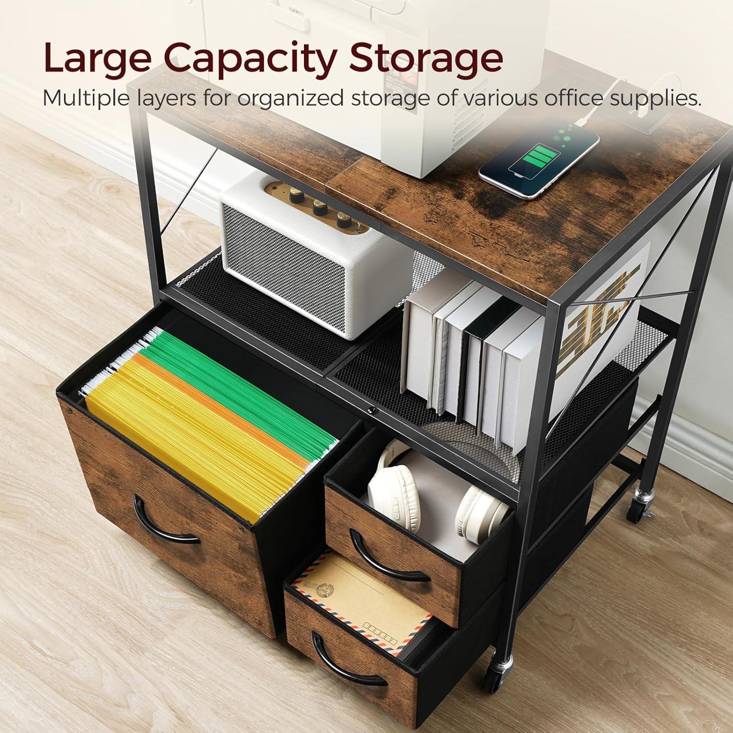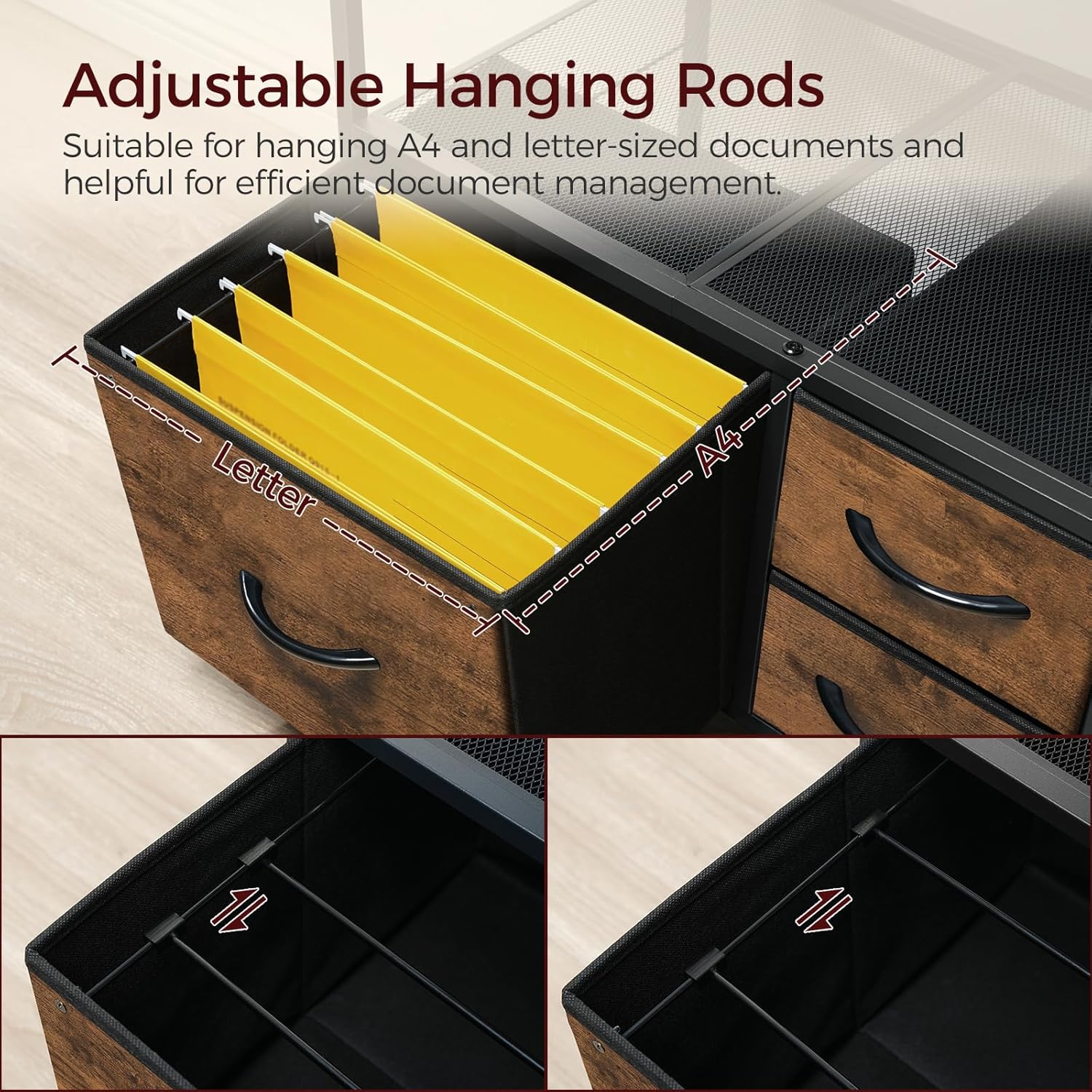Space Organization: This mobile file cabinet has 3 fabric drawers and adjustable hanging rods for office essentials like A4 and letter-sized documents. Its 2 open shelves are perfect for printers, scanners, etc. keeping your workspace organized with ease