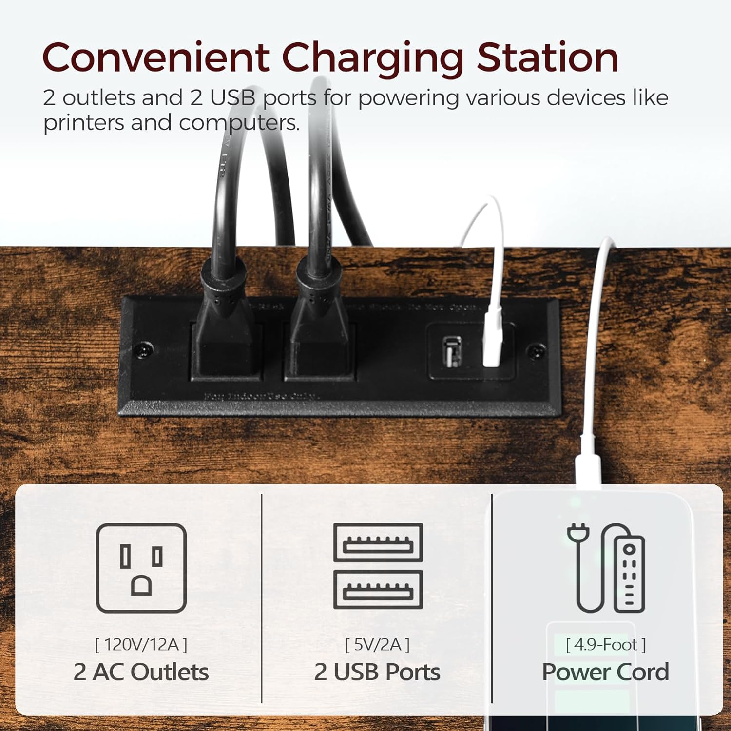 2 outlets and 2 USB ports for powering various devices like printers and computers.