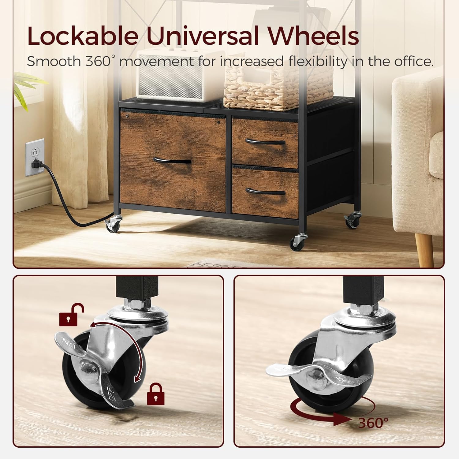 Flexible Movement: Equipped with 4 industrial-grade universal wheels, 2 of which can be locked, this file cabinet with charging station offers flexibility for both fixed and mobile use. It can easily adapt to different layouts and create a flexible working environment
