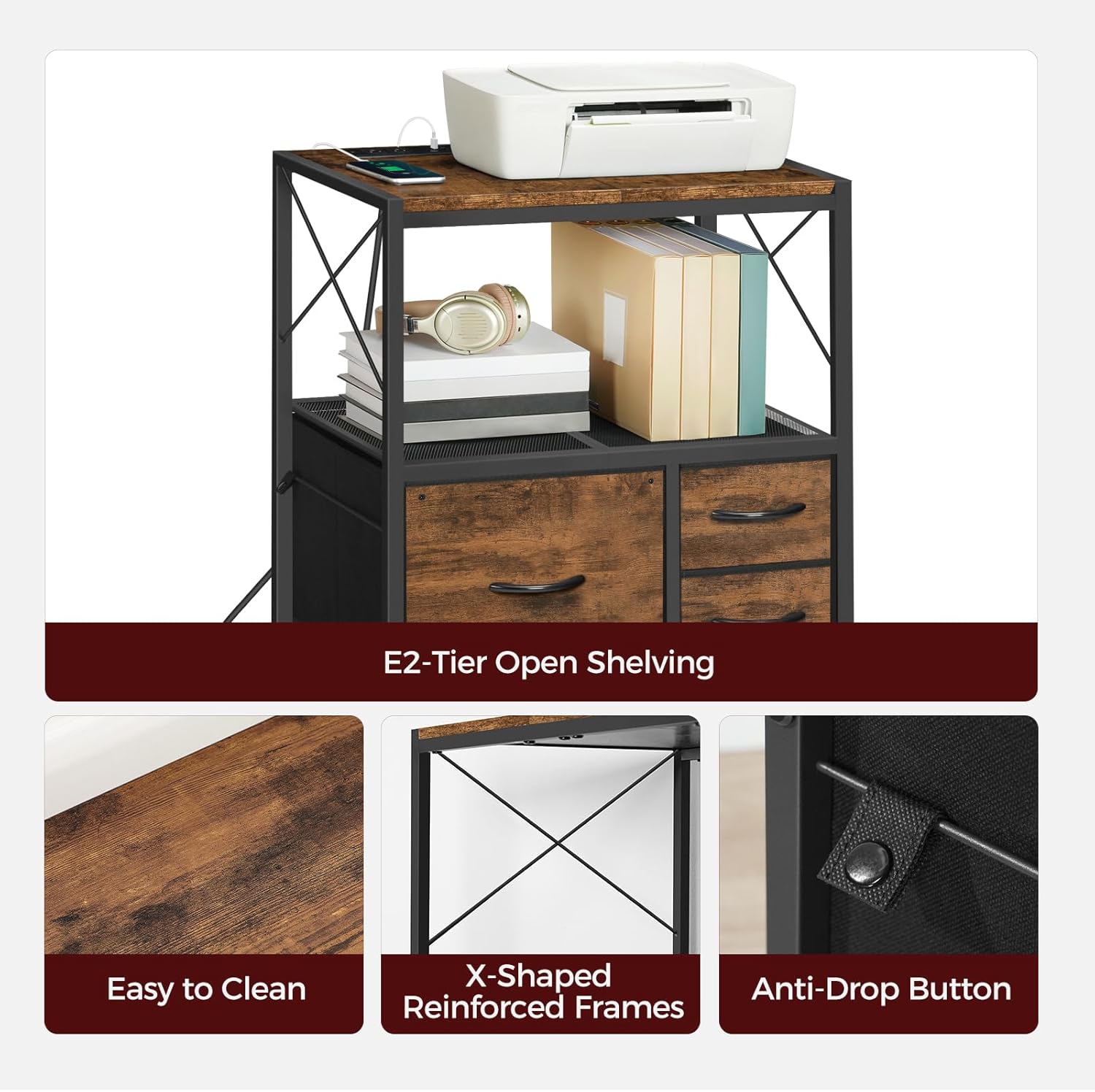 File Cabinet with Charging Station, 3 Drawer Lateral Filing Cabinet for Home Office, Mobile Printer Stand with Open Shelf, Fits A4/Letter Size File, Nonwovens Drawer, Rustic Brown FCHR98E01
