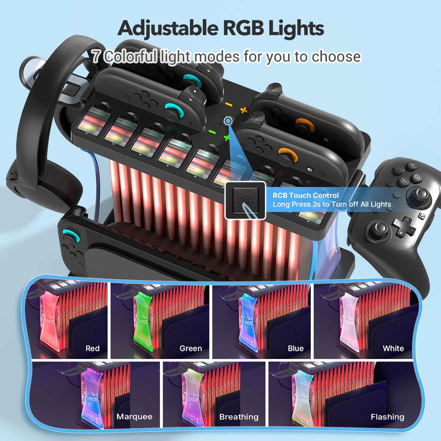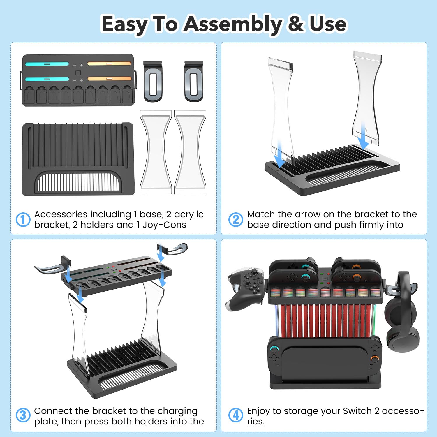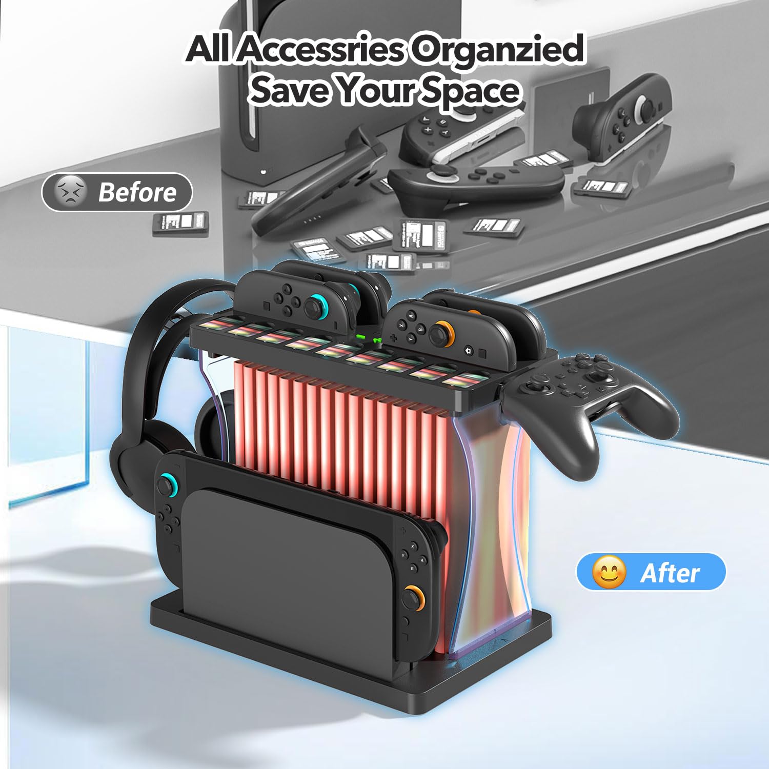 Firven Games Organizer Station with Controller Charger, Charging Dock for Nintendo Switch 2, Display Rack Holder for Switch 2 Dock, Game Cases & Pro Controllers, Accessories Stand with RGB Lighting