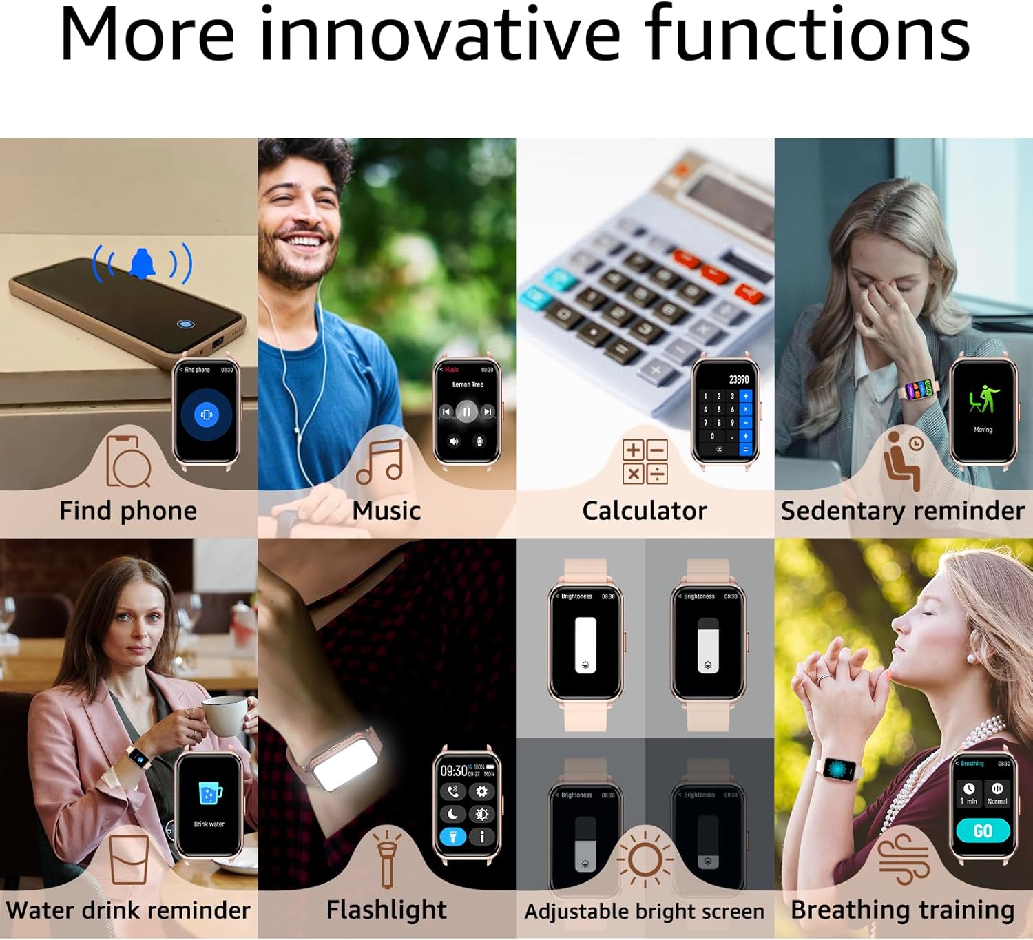 【Your Personal Life Assistant】The smart watch fitness tracker is equipped with rich functions, such as Weather Forecasts, Stopwatch, Timer, Music Control, Brightness Adjustment, Flashlight, Find Phone, Alarm clock, Camera Control, Calculator, Dringking Water Reminder, Sedentary Reminder, Don’t Disturb Mode. These functions can make your life convenient and joyful.