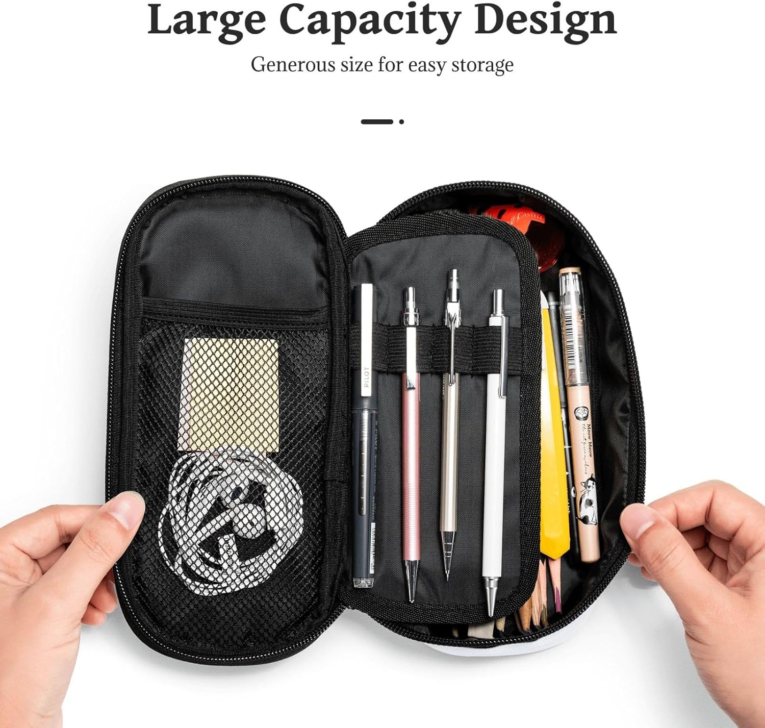 Organized Storage: Equipped with one main compartment featuring a double-headed zipper for smooth operation, a zippered mesh pocket for storage, and four elastic bands designed to securely hold pens or pencils in place.