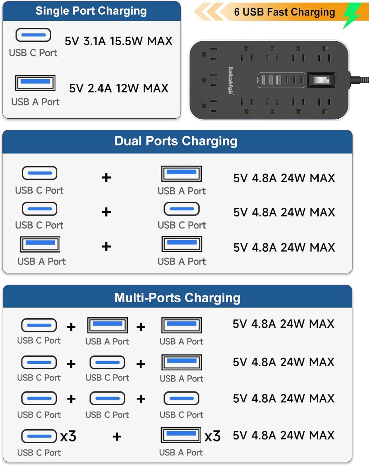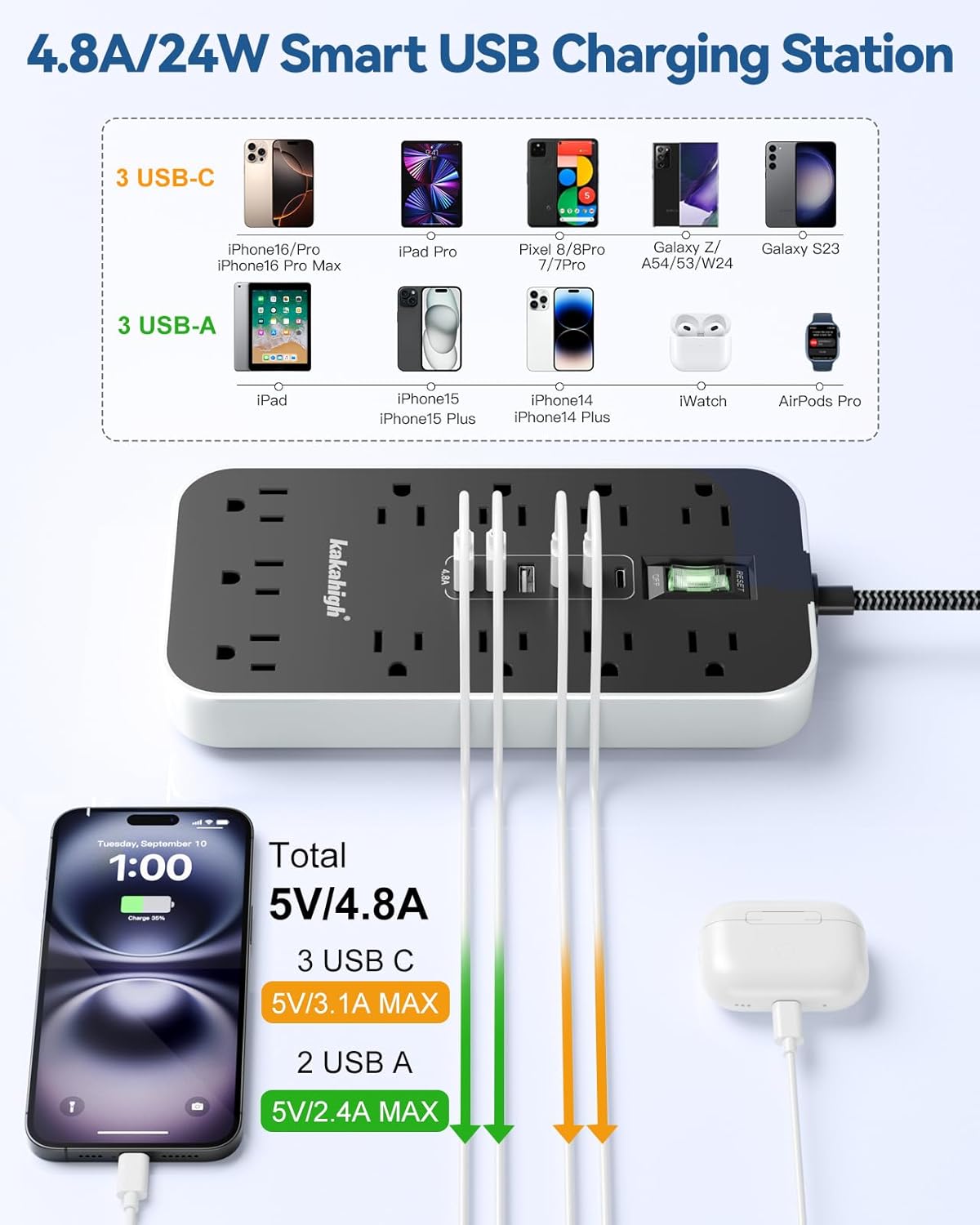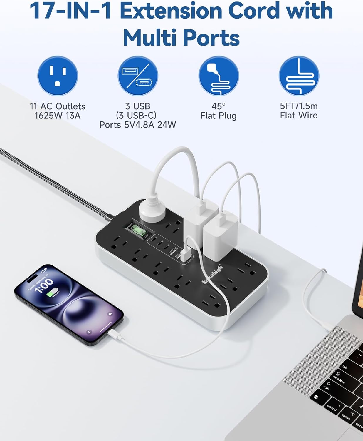 6 USB Fast Charging Station(3 Fast Charging USB-C and 3 USB-A Ports,Total 5V/4.8A/24W) / As Many As 11 Sockets 5Ft Braided Extension Cord with 45-degree Left Angled Ultra Thin Flat Plug. Multiple Safety Protection(Surge Protection and Overload Protection). Wall Mountable & Desktop Power Strip