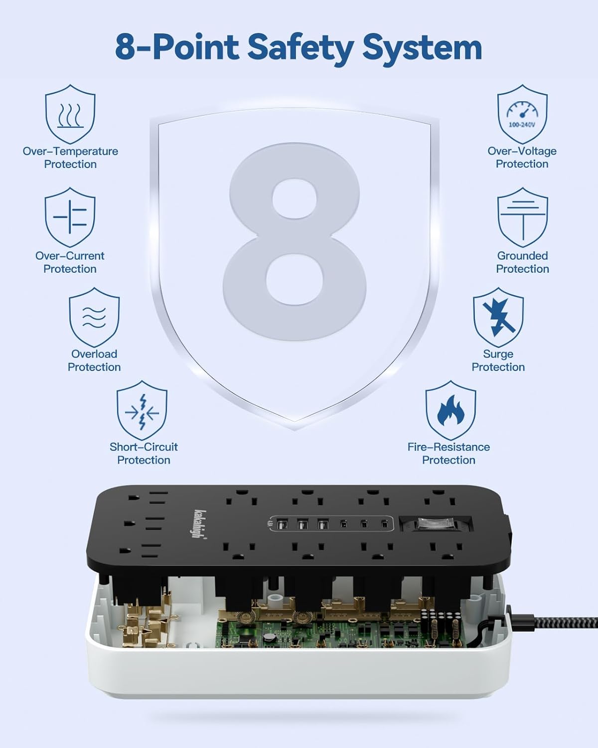 Tailored Spacing for All Plugs Every socket has been meticulously designed and spaced to ensure no two plugs clash, making connections seamless whenever you charge. Absolute Protection With an 8-point safety system covering everything from temperature control to fire resistance, rest easy knowing that your devices and home are always safe. Note1 This power strip built-in USB module supports a wide input voltage range of 100-240V, 50-60Hz. Note2 The USB-A port does not support Quick Charge 3.0. Devices equipped with Quick Charge, such as the Galaxy series, will charge at regular speed. Note3 The USB ports of this product are not compatible with laptops, doesn’t support any other devices which need 9~22V charging voltage. Note4 When all six USB ports are used at the same time, they share a maximum output of 24W. Note5 Surface temperatures may reach 113°F (45°C) during continuous full-load operation – within UL 1363 safety standards.