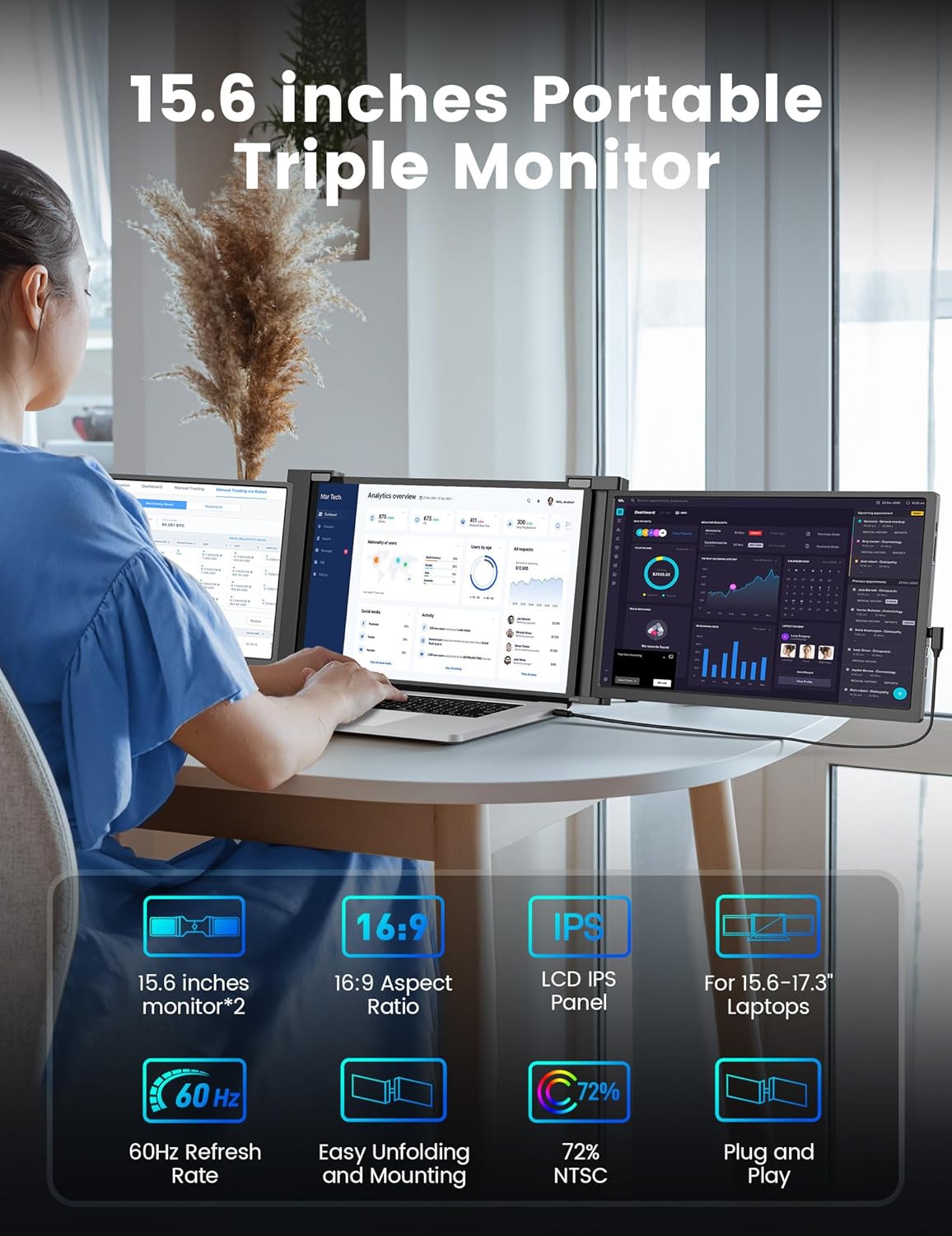 This triple monitor is designed for ultimate portability, fitting seamlessly into your bag. Wherever you are, enjoy the convenience of an extended display that enhances your work experience.