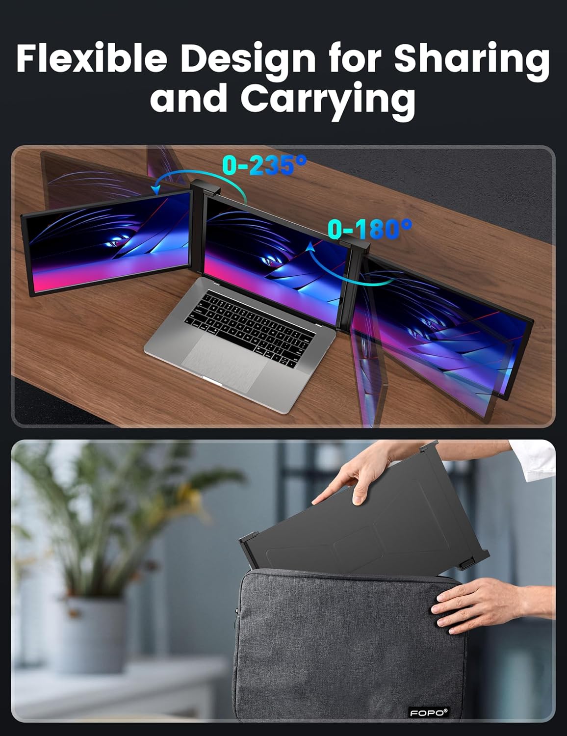 Versatile and Portable: The FOPO triple monitor for laptop offers dual rotatable screens, giving you flexible viewing options. The right screen can rotate from 0 to 180°, while the left screen offers a rotation range of 0 to 235°. Adjust the angle to suit your needs, making it ideal for screen sharing. The portable monitor for laptop comes with a convenient carry bag, and its foldable and lightweight design makes it perfect for business trips, Traveling, remote work, presentations, and more.