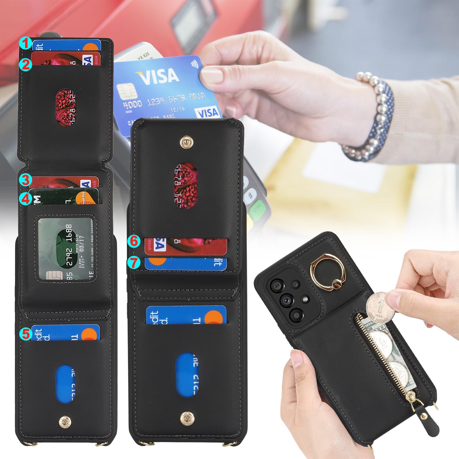 [Card Holder Cases]: 7 card slots for ID card, credit cards card or some cash, without taking purse to outdoor.Snapping the button is perfect to secure your stuff.