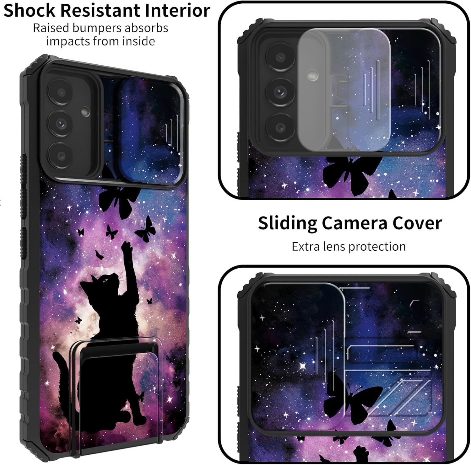 for Samsung Galaxy S24 FE Case with Slide Camera Cover & Built-in Kickstand,Military Grade Dual Layer Shockproof Protective Phone Case for Samsung Galaxy S24 FE,Astral Cat