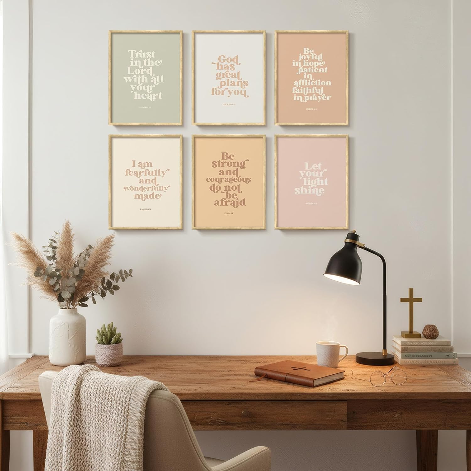 [Framed Christian Wall Art]: Measuring 11×14 inches each, this set of 6 pastel toned scripture prints features uplifting Bible verses such as Trust in the Lord and Let Your Light Shine creating a modern boho gallery wall